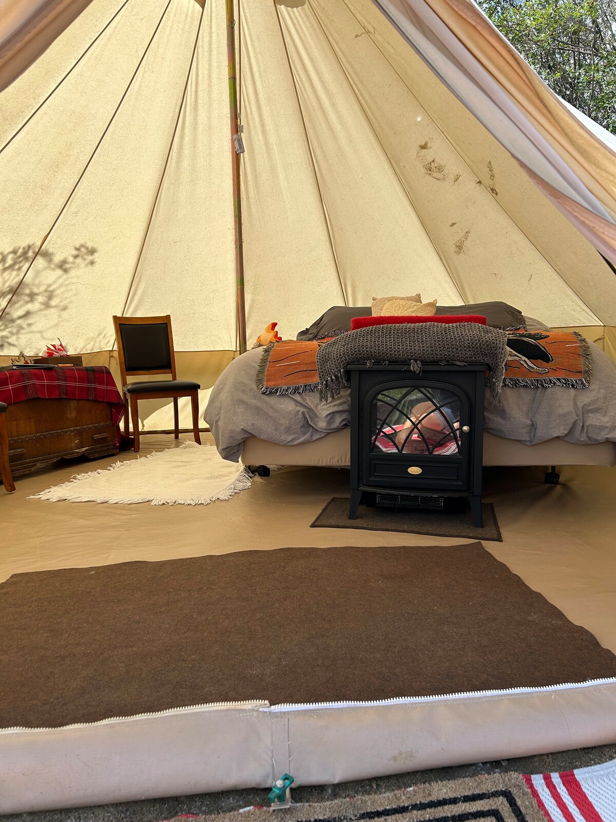 ಕೂಲಿ ಯರ್ಟ್ ಒಳಾಂಗಣವು ಯರ್ಟ್ನ ಟೂನೊ (ಓವರ್ಹೆಡ್ ಗುಮ್ಮಟ) ಅಡಿಯಲ್ಲಿ ಕುಳಿತಿರುವ ಮರದ ಸುಡುವ ಸ್ಟೌವ್ ಸುತ್ತ ಸುತ್ತುತ್ತದೆ. ಇದು ಆರರವರೆಗೆ ಟೇಬಲ್ ಮತ್ತು ಕುರ್ಚಿಗಳನ್ನು ಹೊಂದಿರುವ ತಿನ್ನುವ ಪ್ರದೇಶ, ಕುಳಿತುಕೊಳ್ಳುವ ಪ್ರದೇಶ, ಆಹಾರ ತಯಾರಿಕೆ ಪ್ರದೇಶ, ರಾಣಿ ಹಾಸಿಗೆ, ಎರಡು ಅವಳಿ ಹಾಸಿಗೆಗಳನ್ನು ಹೊಂದಿದೆ (ಒಂದು ಡೇ ಬೆಡ್). ಇದು ಹೆಚ್ಚಿನ ವೇಗದ ಇಂಟರ್ನೆಟ್ ಪ್ರವೇಶವನ್ನು ಹೊಂದಿದೆ. ಹೊರಾಂಗಣ ಅಡುಗೆ ಪ್ರದೇಶವು ಗ್ಯಾಸ್ ಬಾರ್ಬೆಕ್ಯೂ ಮತ್ತು ಸ್ಟೇನ್ಲೆಸ್ ಸ್ಟೀಲ್ ಸಿಂಕ್ ಹೊಂದಿರುವ ನೀರಿನ ವ್ಯವಸ್ಥೆಯನ್ನು ಹೊಂದಿದೆ. ಮತ್ತಷ್ಟು ಕೆಳಗೆ ಬಾತ್ರೂಮ್ಗಳ ಬಗ್ಗೆ ಟಿಪ್ಪಣಿ ನೋಡಿ.. ಈ ಗ್ಲ್ಯಾಂಪ್ಸೈಟ್ ನಿಜವಾಗಿಯೂ ವಿಶಿಷ್ಟವಾಗಿದೆ ಮತ್ತು ನೀವು ಅದನ್ನು ಆನಂದಿಸುತ್ತೀರಿ ಎಂದು ನಾವು ಭಾವಿಸುತ್ತೇವೆ!