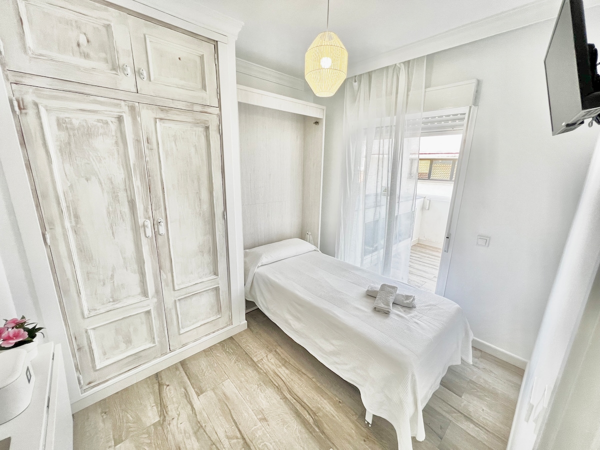 ಸ್ವತಃ ಚೆಕ್-ಇನ್ ದಿನದ 24 ಗಂಟೆಗಳು. ಟೊರೆಮೊಲಿನೋಸ್ನ ಮಧ್ಯಭಾಗದಲ್ಲಿ ನವೀಕರಿಸಲಾಗಿದೆ. ಇದು ಭಾಗಶಃ ಸಾಗರ ಮತ್ತು ನಗರ ವೀಕ್ಷಣೆಗಳೊಂದಿಗೆ ಹವಾನಿಯಂತ್ರಣವನ್ನು ನೀಡುತ್ತದೆ. ಉಚಿತ ವೈಫೈ ಸಂಪರ್ಕ. ಇದು ಬಜೊಂಡಿಲ್ಲೊ ಕಡಲತೀರದಿಂದ 10 ನಿಮಿಷಗಳು ಮತ್ತು ಸ್ಯಾನ್ ಮಿಗುಯೆಲ್ ಬೀದಿಯಿಂದ 300 ಮೀಟರ್ ದೂರದಲ್ಲಿದೆ. ಇದು ಮಲಗುವ ಕೋಣೆ ಪ್ರದೇಶ, ಸೋಫಾ ಹಾಸಿಗೆ ಹೊಂದಿರುವ ಲಿವಿಂಗ್ ಏರಿಯಾ, ಫ್ಲಾಟ್-ಸ್ಕ್ರೀನ್ ಟಿವಿ ಮತ್ತು ಡೈನಿಂಗ್ ಟೇಬಲ್ ಅನ್ನು ಹೊಂದಿದೆ. ಮೈಕ್ರೊವೇವ್ ಮತ್ತು ಫ್ರಿಜ್ ಹೊಂದಿರುವ ಅಡುಗೆಮನೆ. ಬಾತ್ರೂಮ್ಗೆ ಟವೆಲ್ಗಳು, ಹಾಸಿಗೆ, ಕಾಫಿ ಮತ್ತು ಸೌಲಭ್ಯಗಳನ್ನು ಒದಗಿಸಲಾಗಿದೆ.