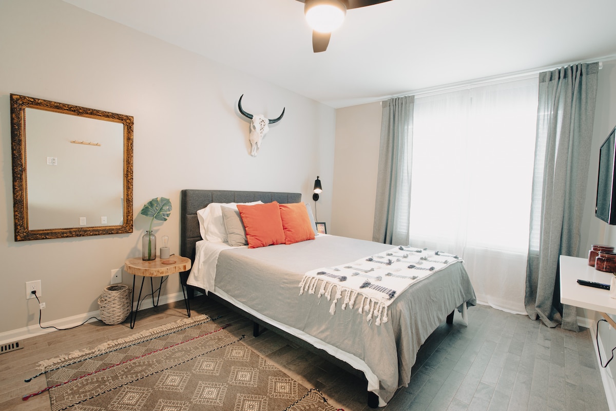 ಸ್ವಾಗತ! ಪ್ರಬುದ್ಧ ಮೇಪಲ್ ಮರಗಳ ನಡುವೆ ನೆಲೆಗೊಂಡಿರುವ ನೀವು ಈ ಖಾಸಗಿ ಬಾರ್ಂಡೋಮಿನಿಯಂನಲ್ಲಿ ಮನೆಯಲ್ಲಿಯೇ ಇರುತ್ತೀರಿ! ಸುರಕ್ಷಿತ, ಸ್ತಬ್ಧ ನೆರೆಹೊರೆಯಲ್ಲಿ 3/4 ಎಕರೆ ಜಾಗದಲ್ಲಿ ನೆಲೆಗೊಂಡಿರುವ ಬಾರ್ಂಡೋಮಿನಿಯಂ ಮುಖ್ಯ ಮನೆಯಿಂದ ಸಂಪೂರ್ಣವಾಗಿ ಪ್ರತ್ಯೇಕವಾಗಿದೆ ಆದರೆ ನಿಮಗೆ ಏನಾದರೂ ಅಗತ್ಯವಿದ್ದರೆ ಸಾಕಷ್ಟು ಹತ್ತಿರದಲ್ಲಿದೆ. ಅಲ್ಲದೆ, ಆ ಹೆಚ್ಚುವರಿ ಶುಲ್ಕವನ್ನು ಪಾವತಿಸುವುದು ಕಿರಿಕಿರಿ ಉಂಟುಮಾಡುತ್ತದೆ ಎಂದು ನಾನು ಅರಿತುಕೊಂಡಿದ್ದೇನೆ ಆದ್ದರಿಂದ ನಾನು ಸ್ವಚ್ಛಗೊಳಿಸುವಿಕೆಯ ಶುಲ್ಕವನ್ನು ಮನ್ನಾ ಮಾಡಿದ್ದೇನೆ! ಬಾತ್ರೂಮ್ ನೆಲ ಮಹಡಿಯಲ್ಲಿದೆ ಮತ್ತು ಮಲಗುವ ಕೋಣೆ 2 ನೇ ಮಹಡಿಯಲ್ಲಿದೆ, ಮೆಟ್ಟಿಲುಗಳ ಮೂಲಕ ಪ್ರವೇಶಿಸಬಹುದು (ಎಲಿವೇಟರ್ ಇಲ್ಲ) ಎಂಬುದನ್ನು ದಯವಿಟ್ಟು ಗಮನಿಸಿ.
