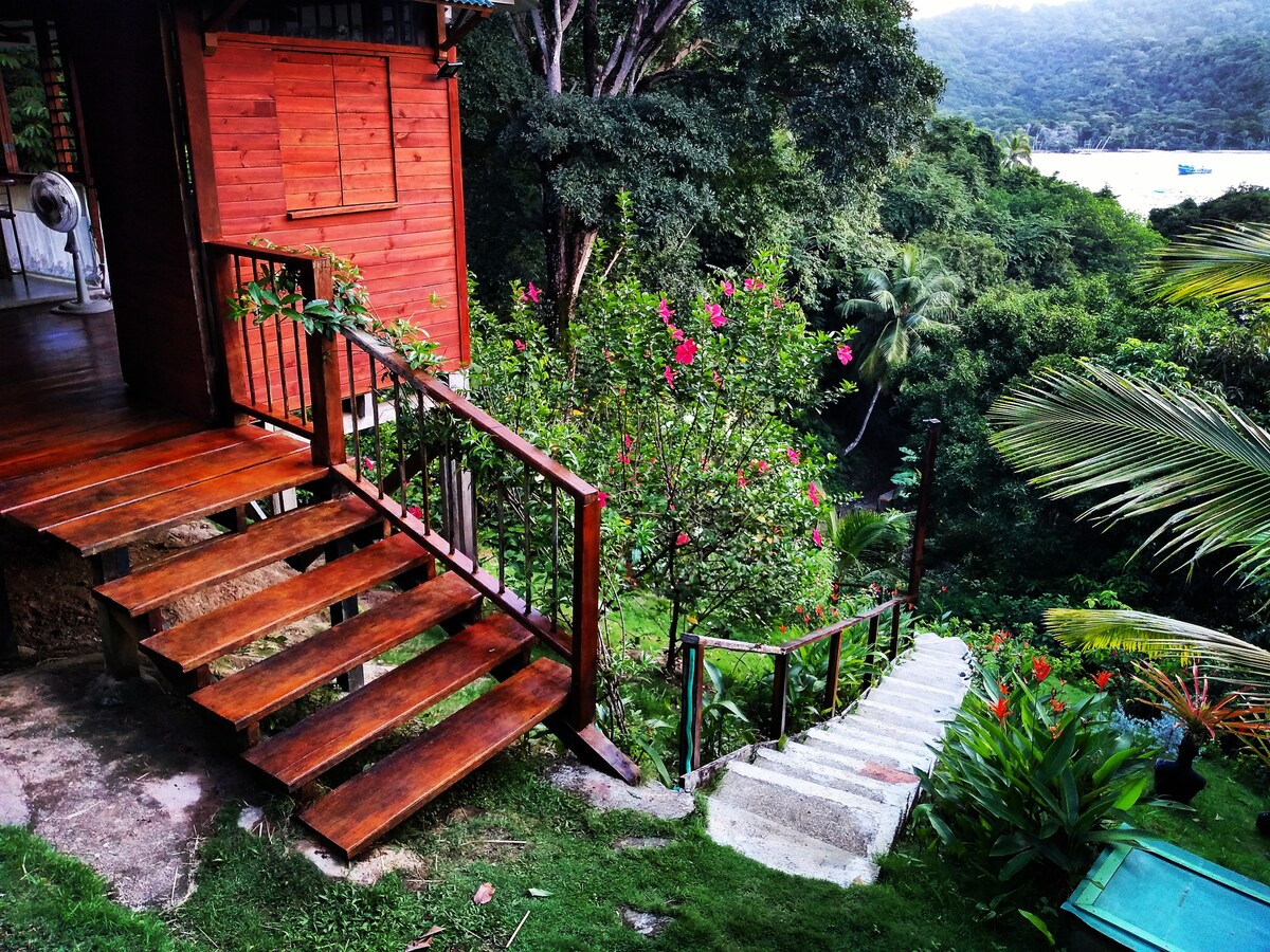 ಸುಂದರವಾದ ಎರಡು ಅಂತಸ್ತಿನ ಮರದ ಕ್ಯಾಬಿನ್, ವಿಭಾಗಗಳಿಲ್ಲದೆ, ಪ್ರತಿ ಮಹಡಿಯಲ್ಲಿ ಬಟ್ಟೆಗಳನ್ನು ಸಂಗ್ರಹಿಸಲು ಸ್ನಾನಗೃಹ ಮತ್ತು ಕ್ಲೋಸೆಟ್, ಸುಸಜ್ಜಿತ ಅಡುಗೆಮನೆ ಮತ್ತು ಟೆರೇಸ್, ಸಮುದ್ರ ಮಟ್ಟದಿಂದ 30 ಮೀಟರ್ ಎತ್ತರದಲ್ಲಿ ಸಂಪೂರ್ಣ ಕೊಲ್ಲಿಯ ಅದ್ಭುತವಾದ ವಿಹಂಗಮ ನೋಟ, 130 ಚದರ ಮೀಟರ್ ವಿಸ್ತೀರ್ಣ ಮತ್ತು ಹೂವುಗಳು ಮತ್ತು ಹಣ್ಣಿನ ಮರಗಳನ್ನು ಹೊಂದಿರುವ ಸುಂದರವಾದ ಉದ್ಯಾನ, ಕಡಲತೀರದಿಂದ ಸುಮಾರು 80 ಮೀಟರ್ ದೂರದಲ್ಲಿ ಮತ್ತು ಹಳ್ಳಿಗೆ ಹತ್ತಿರದಲ್ಲಿದೆ.ಇದು ವೈಫೈ ಮತ್ತು ಸೌರ ಶಕ್ತಿಯನ್ನು ಹೊಂದಿದ್ದು, ಇದು ದಿನದ 24 ಗಂಟೆಗಳ ಕಾಲ ವಿದ್ಯುತ್ ಸೇವೆಯನ್ನು ಖಾತರಿಪಡಿಸುತ್ತದೆ, ಇದು ಕೆರಿಬಿಯನ್ ಕಾಡಿನಿಂದ ಸುತ್ತುವರಿದಿದೆ. RNT 96235