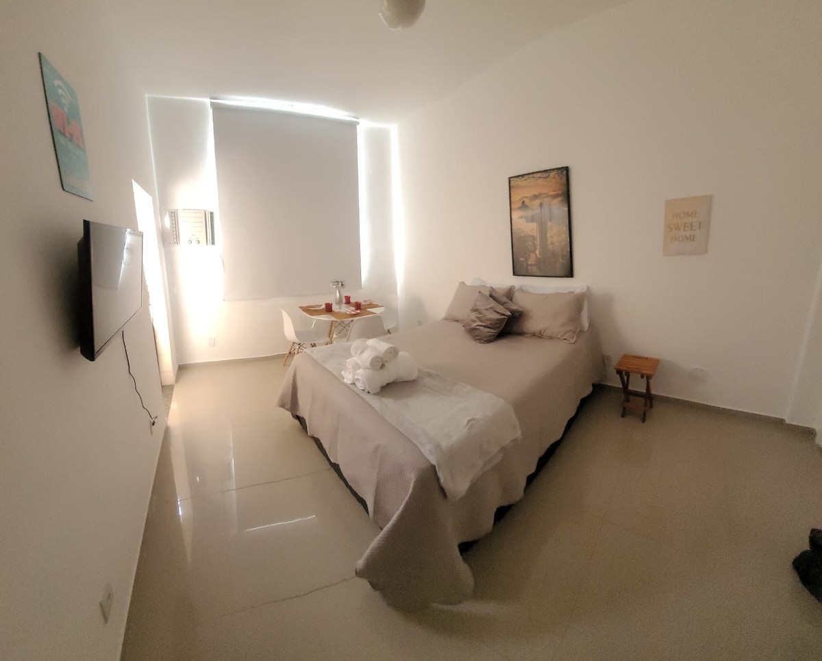 Este aconchegante apartamento fica no coração de Copacabana, próximo à praia, metrô, ônibus e todas as comodidades que o bairro oferece! Reformado e com móveis planejados que proporcionam mais conforto e espaço. A suíte é o lugar onde os hóspedes vão ter momentos de descanso e relaxamento para aproveitarem a cidade. Composta de um sofá de 3 metros retrátil, que serve como uma cama de casal auxiliar, TV 65 polegadas, área de Escritorio, frigobar e confortável cama. Ventiladores e Ar Condicionado.