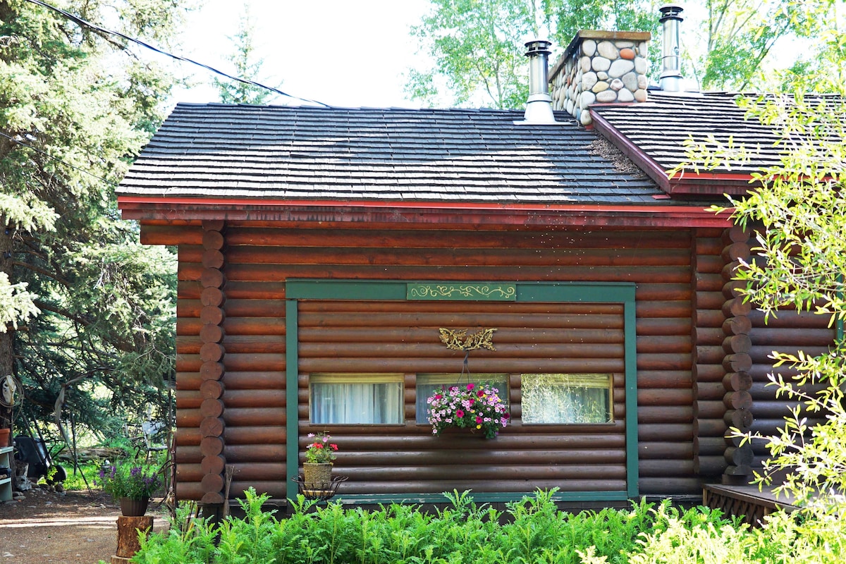 Grown-Up Getaway Adventurers' 2 Season River Cabin! 1-4-persons, charming, Boho, rustic Log Studio stocked with organic breakfast choices, snacks. Secluded, safe. Perfect for single's trip, romantic escape, sports, work/study. Nestled in surrounding, old spruce trees, along a mountain river in heart of Rockies. Peaceful, river sounds lull you to sleep. *NOT for those seeking the conventional. This is Real Rustic, Creative Cabin West.*Hosts on-site to answer recreation, events, dining questions.