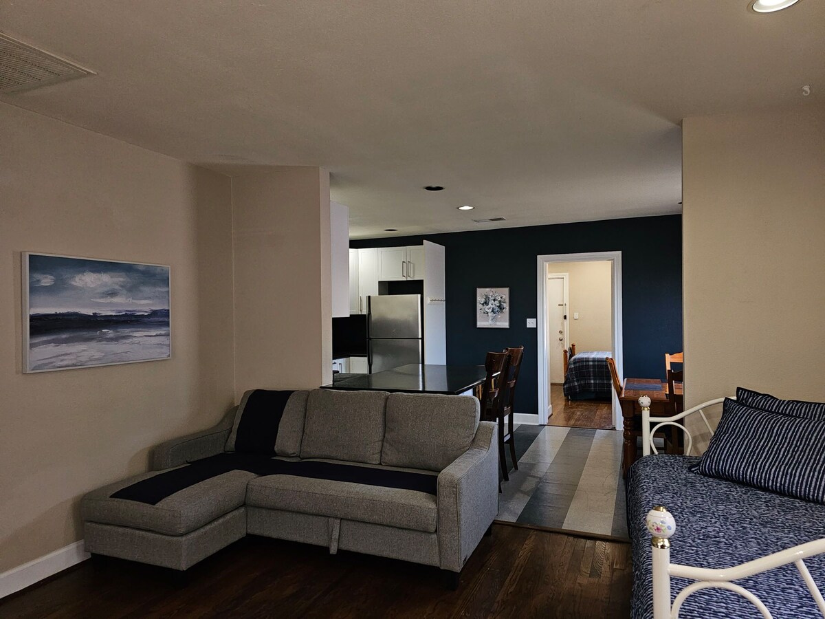 ಅಪ್ಡೇಟ್: ಪ್ರತಿ ಗೆಸ್ಟ್ಗೆ ಮೊದಲು ಮತ್ತು ನಂತರ ಪ್ರತಿ ರೂಮ್ ಅನ್ನು ಸ್ವಚ್ಛಗೊಳಿಸಲು ನಾವು ಯಾವಾಗಲೂ ವೃತ್ತಿಪರ ಶುಚಿಗೊಳಿಸುವ ಸೇವೆಗಳನ್ನು ಒದಗಿಸಿದ್ದೇವೆ. COVID-19 ಕಾರಣದಿಂದಾಗಿ ನಿಮ್ಮ ಸ್ಥಳವನ್ನು ಸೋಂಕುನಿವಾರಕಗೊಳಿಸಲು ನಾವು ಈಗ ಹೆಚ್ಚುವರಿ ಕಾಳಜಿ ವಹಿಸುತ್ತಿದ್ದೇವೆ. ಖಾಸಗಿ ಪ್ರವೇಶದೊಂದಿಗೆ (ಬೇರ್ಪಡಿಸಿದ ಗ್ಯಾರೇಜ್ನ ಮೇಲೆ) ಸಂಪೂರ್ಣವಾಗಿ ಸಜ್ಜುಗೊಳಿಸಲಾದ ಸ್ಟುಡಿಯೋ ಅಪಾರ್ಟ್ಮೆಂಟ್. ಒಂದು ರಾಣಿ ಗಾತ್ರದ ಹಾಸಿಗೆ ಮತ್ತು ಪೂರ್ಣ ಗಾತ್ರದ ಪಾಪ್-ಅಪ್ ಸೋಫಾ ಹಾಸಿಗೆಯನ್ನು ಒಳಗೊಂಡಿದೆ. ಡಿವಿಡಿ ಮತ್ತು ಸ್ಟಿರಿಯೊ ಸೌಂಡ್ನೊಂದಿಗೆ ಸಂಪೂರ್ಣವಾಗಿ ಸುಸಜ್ಜಿತ ಅಡುಗೆಮನೆ(ಕ್ಯೂರಿಗ್, ಪ್ಯಾನ್ಗಳು, ಕಟ್ಲರಿ ಮತ್ತು ಭಕ್ಷ್ಯಗಳು) 42" ಸ್ಮಾರ್ಟ್ ಟಿವಿ, (ಡಿಸ್ನಿ+, ನೆಟ್ಫ್ಲಿಕ್ಸ್, ಅಮೆಜಾನ್ ಪ್ರೈಮ್ ಮತ್ತು ಹುಲು).