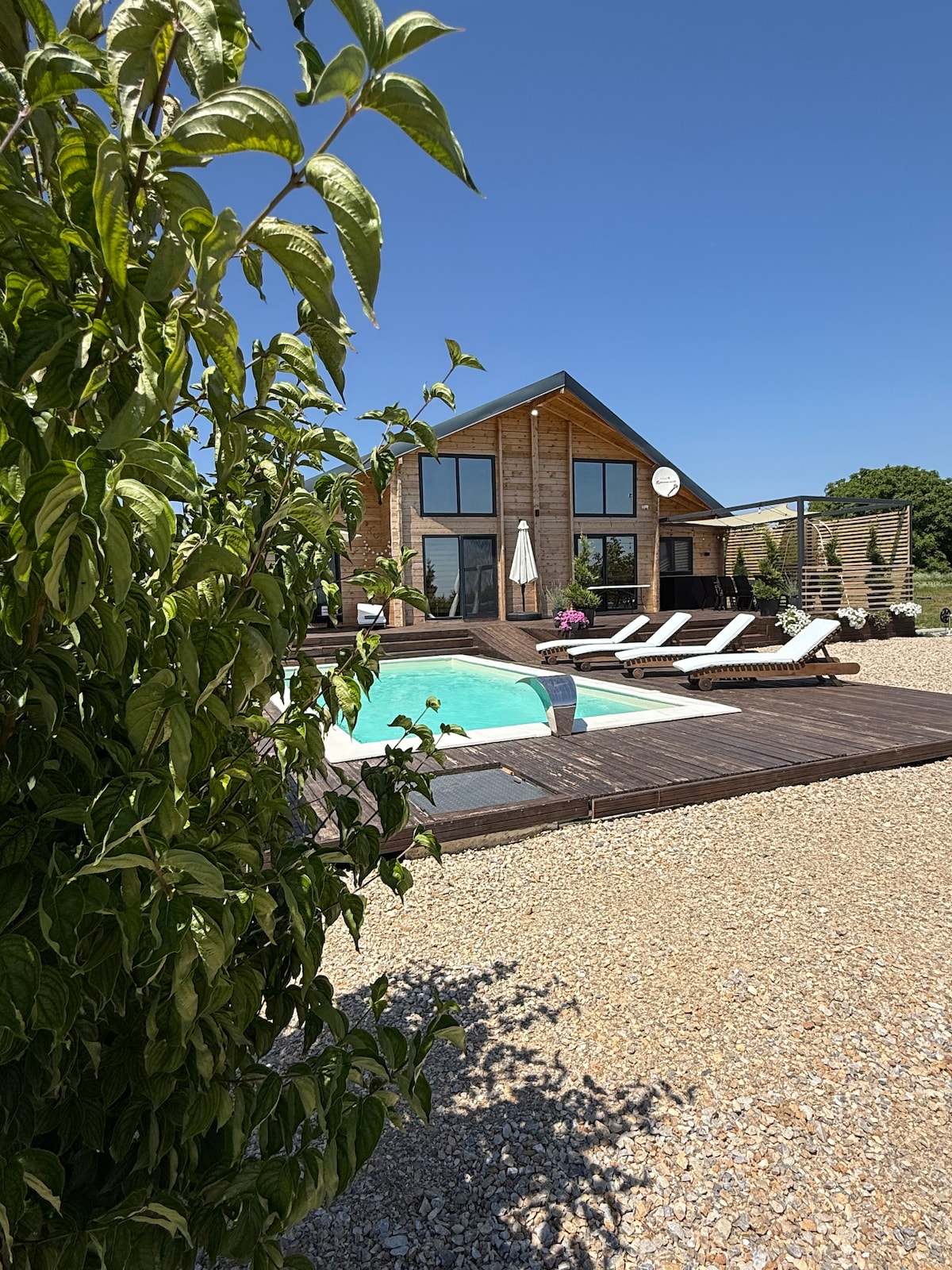 A modern wooden house surrounded by nature, featuring a private heated pool, jacuzzi and sauna. Spacious interior, fully equipped kitchen, comfortable bedrooms and large outdoor area make it perfect for relaxing