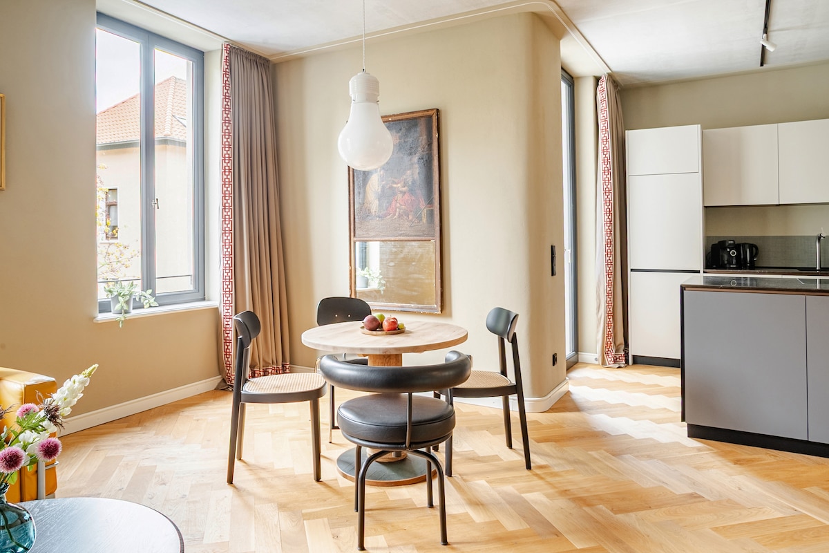ಹಿಂದಿನ ರಿಡ್ಡಾಗ್ಶೌಸೆನ್ ಫೋರ್ಸ್ಟೇರಿಯ ಹಳೆಯ ಗೋಡೆಗಳಲ್ಲಿ ಐಷಾರಾಮಿ ಅಪಾರ್ಟ್ಮೆಂಟ್ಗಳು: ಸಂಜೆ, "ಸಿಟಿ ಕಂಟ್ರಿ ಬಾರ್ನ್" ನ ಉದ್ಯಾನವನದಂತಹ ಉದ್ಯಾನವನದ ಮೇಲಿರುವ ವಿಶಾಲವಾದ ಕಿಟಕಿ ಸಿಲ್ಗಳಲ್ಲಿ ಒಂದರಲ್ಲಿ ಕುರಿ ಚರ್ಮದ ಮೇಲೆ ಆರಾಮವಾಗಿ ಕುಳಿತುಕೊಳ್ಳಿ. ಗ್ಯಾಸ್ ಫೈರ್ಪ್ಲೇಸ್ನ ಮಿನುಗುವ ಬೆಳಕನ್ನು ಆನಂದಿಸಿ ಅಥವಾ ಅಡುಗೆ ದ್ವೀಪದಲ್ಲಿ ಸ್ನೇಹಿತರೊಂದಿಗೆ ಅಡುಗೆ ಮಾಡಿ. ರೂಮ್ ಎತ್ತರ ಮತ್ತು ಆಕರ್ಷಕ ಛಾವಣಿಯ ಟ್ರಸ್ನಿಂದ ವಾಸ್ತುಶಿಲ್ಪೀಯವಾಗಿ ಮಂತ್ರಮುಗ್ಧರಾಗಿರಿ. ಜಪಾನಿನ ಶವರ್ ಶೌಚಾಲಯ. ಮೋಡಗಳಂತೆ ಮಲಗಲು ತೆಂಪುರ್ ಹಾಸಿಗೆಗಳು ಮತ್ತು ದಿಂಬಿನ ಬಫೆಟ್.