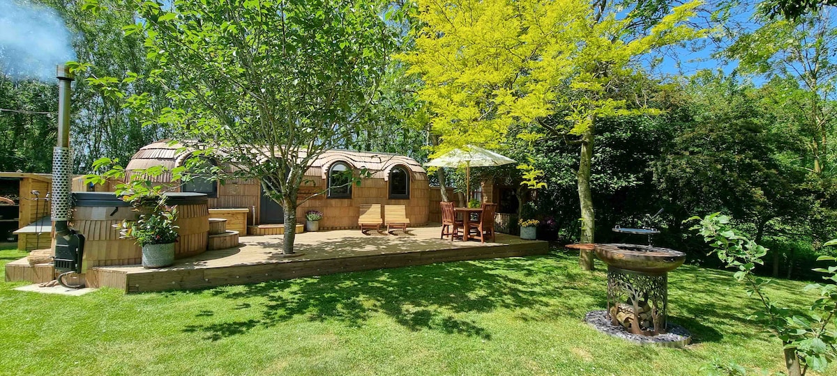 If you love beautiful views and value your privacy, our luxury hut ticks all the boxes. It's fully connected to mains electrics and water and even has a flushing loo. Features include:- Hot Tub for 2 (off grid, stillwater, wood fired) Night solar festoon light Luxury Sauna Fire pit Breakfast Basket (Vegan Options) 270 degree Views Full Ensuite Lafuma loungers x 2 Cooker, fridge and sink (hot and cold water) Woodburner Bike store BBQ Super fast WiFi Mega comfortable double bed Walks from door