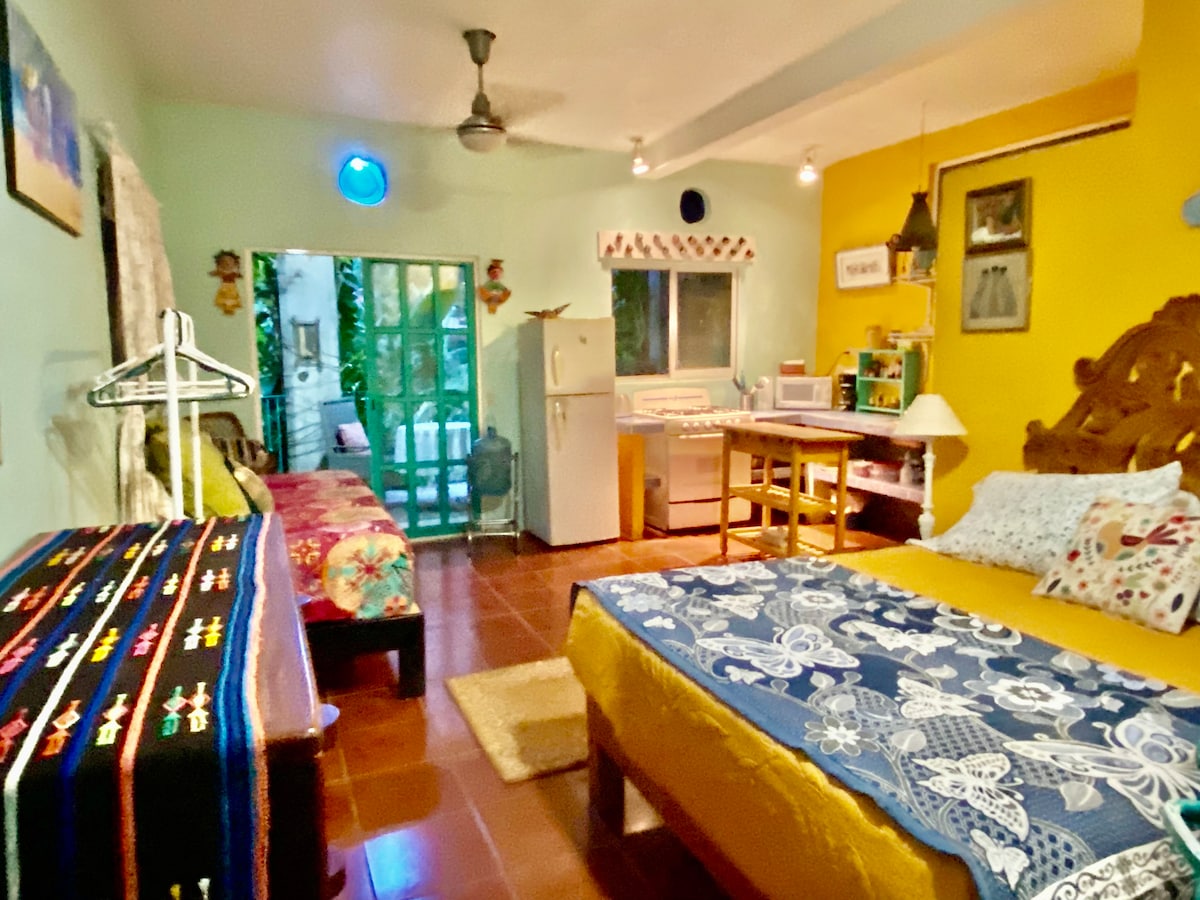 Jungle Bungalow is a charming . stone and brick house, large patio, close the beach, stores, restaurants, spacious patio with outdoor grill overlooks a lush gated garden with bananas and papaya trees. Just outside the gate is the beautiful natural Horcones River. It has one queen and one double bed, one accessed by a ladder that folds out from the wall. Decorated beautifully and tastefully it has a fully equipped kitchen, AC, overhead fans, and access to a laundry room. Reverberates with charm.