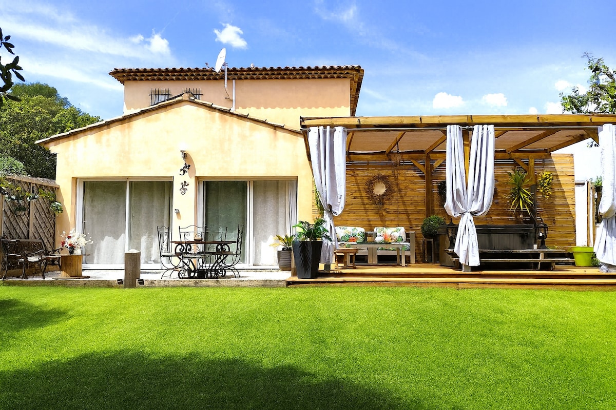 ಬ್ರಿಗ್ನೋಲ್ಸ್ (4 ಕಿ .ಮೀ) ಬಳಿ VAR ನ ಮಧ್ಯಭಾಗದಲ್ಲಿರುವ ಶಾಂತಿಯುತ ವಿಲ್ಲಾ ಇದೆ ಸಮುದ್ರ ಮತ್ತು ಪರ್ವತದ ನಡುವೆ ಅರ್ಧದಾರಿಯಲ್ಲಿರುವ ವಿಶಿಷ್ಟ ಪ್ರೊವೆನ್ಕಲ್ ಗ್ರಾಮವಾದ ಕ್ಯಾಂಪ್ಸ್ ಲಾ ಸೋರ್ಸ್ನಲ್ಲಿದೆ. VAR ಇಲಾಖೆಯು ಏನು ನೀಡುತ್ತದೆ ಎಂಬುದನ್ನು ಹೆಚ್ಚು ಬಳಸಿಕೊಳ್ಳಲು ಸೂಕ್ತವಾಗಿದೆ. ವಿಲ್ಲಾವನ್ನು ಕಡೆಗಣಿಸಲಾಗಿಲ್ಲ, ಆದರೆ ಪ್ರತ್ಯೇಕವಾಗಿಲ್ಲ. ಹೊರಗೆ, ನೀವು ಬಿಸಿಯಾದ 8x4 ಉಪ್ಪು ಪೂಲ್ ಅನ್ನು ಆನಂದಿಸುತ್ತೀರಿ. ಈ ಪೂಲ್ ಮೇ ಮಧ್ಯದಿಂದ ಸೆಪ್ಟೆಂಬರ್ ಮಧ್ಯದವರೆಗೆ ತೆರೆದಿರುತ್ತದೆ (ಇದು ಹವಾಮಾನವನ್ನು ಅವಲಂಬಿಸಿ ಬದಲಾಗಬಹುದು) ನೀವು ಪೂಲ್ ಬಳಿ ಬೇಸಿಗೆಯ ಅಡುಗೆಮನೆಯನ್ನು ಸಹ ಹೊಂದಿದ್ದೀರಿ