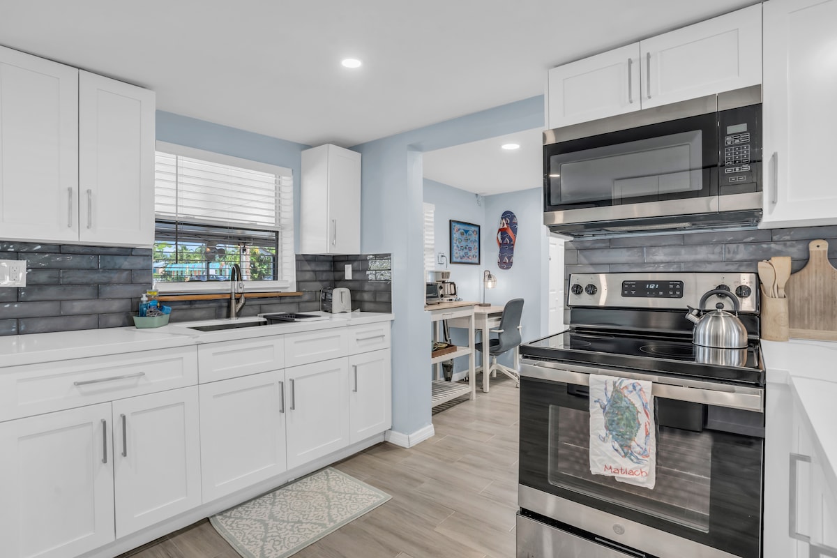 ಅಪ್ಡೇಟ್: ಸೆಪ್ಟೆಂಬರ್ 2022 ರಲ್ಲಿ ನಾವು ಇಯಾನ್ ಚಂಡಮಾರುತದಿಂದ ಪ್ರಭಾವಿತರಾದೆವು. ನಮ್ಮ ಅಮೂಲ್ಯವಾದ ಕಾಟೇಜ್ನಲ್ಲಿ ಕೇವಲ 5 ಅಡಿಗಳಷ್ಟು ಪ್ರವಾಹ ಉಂಟಾಯಿತು. ಎಲ್ಲವನ್ನೂ ಮತ್ತೆ ಒಟ್ಟಿಗೆ ಸೇರಿಸಲು ನಾವು ದಣಿವರಿಯಿಲ್ಲದೆ ಕೆಲಸ ಮಾಡಿದ್ದೇವೆ. ಎಲ್ಲಾ ಹೊಸ ಟೈಲ್, ಗೋಡೆಗಳು, ವಿದ್ಯುತ್, ಬೆಳಕು, ಪೀಠೋಪಕರಣಗಳು ಮತ್ತು ನಾವು ಬಾತ್ರೂಮ್ ಅನ್ನು ಸಹ ಸುಧಾರಿಸಿದ್ದೇವೆ! ನಮ್ಮ ಹಿಂಭಾಗದ ಅಂಗಳದ ಲಾನೈನಿಂದ ನೀರಿನ ನೋಟವನ್ನು ಹೊಂದಿರುವ ವಿಶಾಲವಾದ ಉಷ್ಣವಲಯದ ಮನೆ. ಕ್ಲೀನಿಂಗ್ ಫಿಶ್ ಸ್ಟೇಷನ್ ಹೊಂದಿರುವ ದೋಣಿ ಡಾಕ್, ನಮ್ಮ ಕಾಲುವೆಯಲ್ಲಿ ಮೀನು ಜಿಗಿಯುವ BBQ ಸುಂದರವಾದ ಸೂರ್ಯಾಸ್ತಗಳು. ಹೊಸ ದೊಡ್ಡ ಅಡುಗೆಮನೆ ಮತ್ತು ಕಲಾ ಗ್ಯಾಲರಿಗಳು, ರೆಸ್ಟೋರೆಂಟ್ಗಳು ಮತ್ತು ಬಾರ್ಗಳಿಂದ ಒಂದು ಬ್ಲಾಕ್.