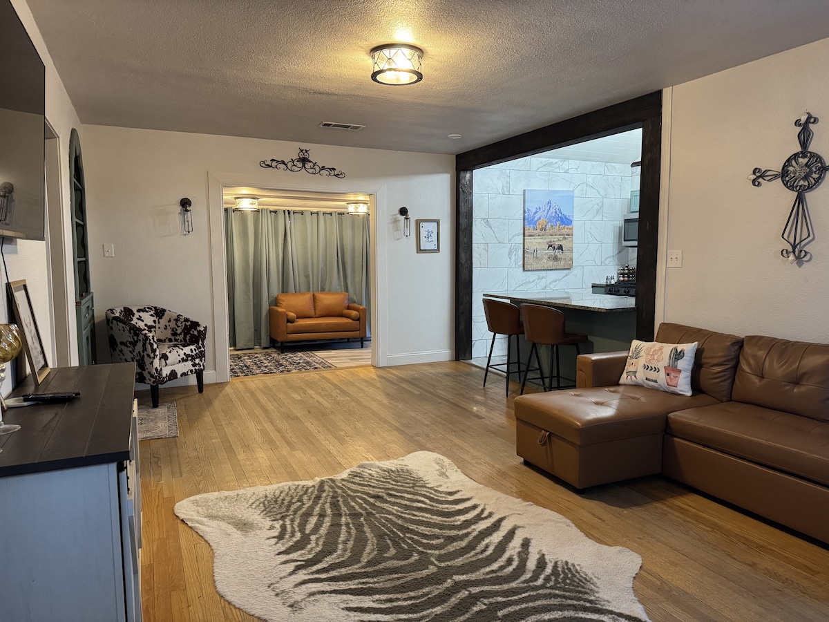ನೀವು ಅನನ್ಯ ಟ್ವಿಸ್ಟ್ನೊಂದಿಗೆ ಆರಾಮದಾಯಕ, ಸುರಕ್ಷಿತ, ಸ್ವಚ್ಛ ಮತ್ತು ಕೈಗೆಟುಕುವ ದರದಲ್ಲಿ ವಾಸ್ತವ್ಯವನ್ನು ಹುಡುಕುತ್ತಿದ್ದರೆ? ನಂತರ ಇದು ಇಲ್ಲಿದೆ, ಏಕೆಂದರೆ ಬ್ರೇಕ್ಫಾಸ್ಟ್ ಅನ್ನು ಸೇರಿಸಲಾಗುತ್ತದೆ ಮತ್ತು ಬಿಗ್ ಡಾಗ್ಸ್ ಫುಡ್ ಟ್ರಕ್ ಮೂಲಕ ಬಾಗಿಲಿಗೆ ತರಲಾಗುತ್ತದೆ. ಇದು ಪೂರ್ಣ ಅಡುಗೆಮನೆ ಮತ್ತು ಕಾಫಿ ಸೆಟಪ್ ಹೊಂದಿರುವ ಹೊಸದಾಗಿ ನವೀಕರಿಸಿದ 1 ಬೆಡ್ರೂಮ್ ಮನೆಯಾಗಿದೆ. ಡಿಟರ್ಜೆಂಟ್ ಲಭ್ಯವಿರುವ ಹೊಚ್ಚ ಹೊಸ ವಾಷರ್ ಮತ್ತು ಡ್ರೈಯರ್ ಇದೆ. ಇದು ಸರೌಂಡ್ ಸೌಂಡ್ ಹೊಂದಿರುವ 65 ಇಂಚಿನ ಟಿವಿ ಹೊಂದಿದೆ. ಮಲಗುವ ವ್ಯವಸ್ಥೆಗಳಿಗಾಗಿ ರಾಣಿ ಗಾತ್ರದ ಹಾಸಿಗೆ ಮತ್ತು ಮರೆಮಾಚುವ ಮಂಚವಿದೆ. ಇದು ಪ್ರಶಾಂತ ಮತ್ತು ಸುರಕ್ಷಿತ ನೆರೆಹೊರೆಯಾಗಿದೆ.
