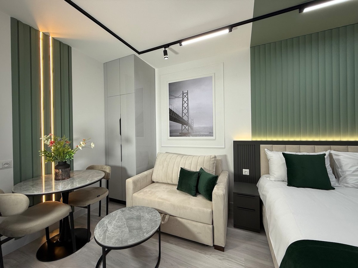 4 ಗೆಸ್ಟ್ಗಳನ್ನು ಮಲಗಿಸುವ ಈ ಕೇಂದ್ರೀಕೃತವಾದ ಒಂದು ಮಲಗುವ ಕೋಣೆ ಅಪಾರ್ಟ್ಮೆಂಟ್ನಲ್ಲಿ ಸೊಗಸಾದ ಅನುಭವವನ್ನು ಆನಂದಿಸಿ. ಉತ್ತಮ ಸ್ಥಳ ಮತ್ತು ದೀರ್ಘ ಅಥವಾ ಸಣ್ಣ ಟ್ರಿಪ್ಗೆ ನಿಮಗೆ ಅಗತ್ಯವಿರುವ ಎಲ್ಲದಕ್ಕೂ ಅನುಕೂಲಕರವಾಗಿ ಪ್ರವೇಶಿಸಬಹುದು. ಸೋಫಾ ಹಾಸಿಗೆ ಹೊಂದಿರುವ ಲಿವಿಂಗ್ ರೂಮ್ ಮತ್ತು ಊಟದ ಪ್ರದೇಶ, ಉಪಕರಣಗಳನ್ನು ಹೊಂದಿರುವ ಅಡುಗೆಮನೆ ಇಂಕ್ ಮೈಕ್ರೊವೇವ್ ಮತ್ತು ಕಾಫಿ ಯಂತ್ರ, ಡಬಲ್ ಬೆಡ್,ಬಾತ್ರೂಮ್ ಮತ್ತು ಬಾಲ್ಕನಿಯನ್ನು ಹೊಂದಿರುವ ಮಲಗುವ ಕೋಣೆ. ನಿಮ್ಮ ಆರೋಗ್ಯವು ನಮ್ಮ ಆದ್ಯತೆಯಾಗಿದೆ. ವೃತ್ತಿಪರ ಶುಚಿಗೊಳಿಸುವ ಕಾರ್ಯತಂತ್ರದ ಸೋಂಕುನಿವಾರಕದೊಂದಿಗೆ ನಮ್ಮ ಮನೆ ವರ್ಧಿತ ಶುಚಿಗೊಳಿಸುವ ಪ್ರೋಟೋಕಾಲ್ ಅನ್ನು ಅನುಸರಿಸುತ್ತದೆ. ನಿಮ್ಮ ವಾಸ್ತವ್ಯವನ್ನು ಆನಂದಿಸಿ!