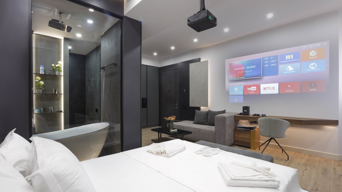 ಪೆಂಟ್ ಹೌಸ್ ಸ್ಟುಡಿಯೋ ಕ್ಯಾಸ್ಕೇಡ್ ಕಾಂಪ್ಲೆಕ್ಸ್ನ ವಿಹಂಗಮ ನೋಟವನ್ನು ಹೊಂದಿರುವ ಲಿವಿಂಗ್ ರೂಮ್ ಮತ್ತು ಮಲಗುವ ಕೋಣೆ (50 ಚದರ / ಮೀ) ಅನ್ನು ಒಳಗೊಂಡಿದೆ, ಒಪೆರಾ ಥಿಯೇಟರ್ ಕಟ್ಟಡಕ್ಕೆ ಎರಡು ನಿಮಿಷಗಳ ನಡಿಗೆ. ಒಳಾಂಗಣವನ್ನು ECO ವಸ್ತುಗಳಿಂದ (ಗ್ರಾನೈಟ್ - ಅಮೃತಶಿಲೆ - ಓನಿಕ್ಸ್ - ಟ್ರಾವೆರ್ಟೈನ್ - ಮರ) ಪ್ರತ್ಯೇಕವಾಗಿ ತಯಾರಿಸಲಾಗಿದೆ. ಇದು ನಮ್ಮ ಗೆಸ್ಟ್ಗಳಿಗೆ ವಿಶ್ರಾಂತಿ ಪಡೆಯಲು ಆರಾಮ ಮತ್ತು ಶಕ್ತಿಯನ್ನು ಒದಗಿಸುತ್ತದೆ. 24 ಗಂಟೆಗಳ ಕನ್ಸೀರ್ಜ್ ಸೇವೆ . ಸಭೆ ಮತ್ತು ವಿಮಾನ ನಿಲ್ದಾಣ ವರ್ಗಾವಣೆ
