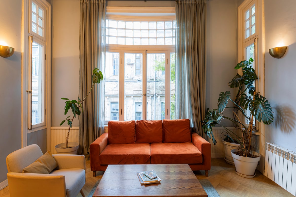 Enjoy your stay in the hottest spot of Tbilisi, surrounded with 5 star hotels: Biltmore, Radisson, Stamba and Rooms and just steps away from Rustaveli metro station and all the main attractions. You will be staying in the vintage loft, located on the top floor of a 1930s stone-built building, with a private terrace and beautiful views. Floor to ceiling windows provide plenty of sunshine, natural light and beautiful views from every room, but there are also heavy curtains for daytime dreamers:)