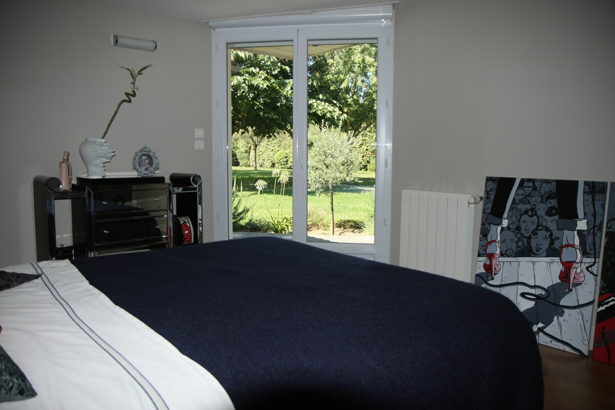 Belle chambre appartenant à un poolhouse indépendant de l'habitation principale avec salle de bain (douche + wc). Plus cuisine avec tout le nécessaire pour coin repas. (Frigo , micro-ondes, bouilloire pour café 'thé etc) Parking gratuit