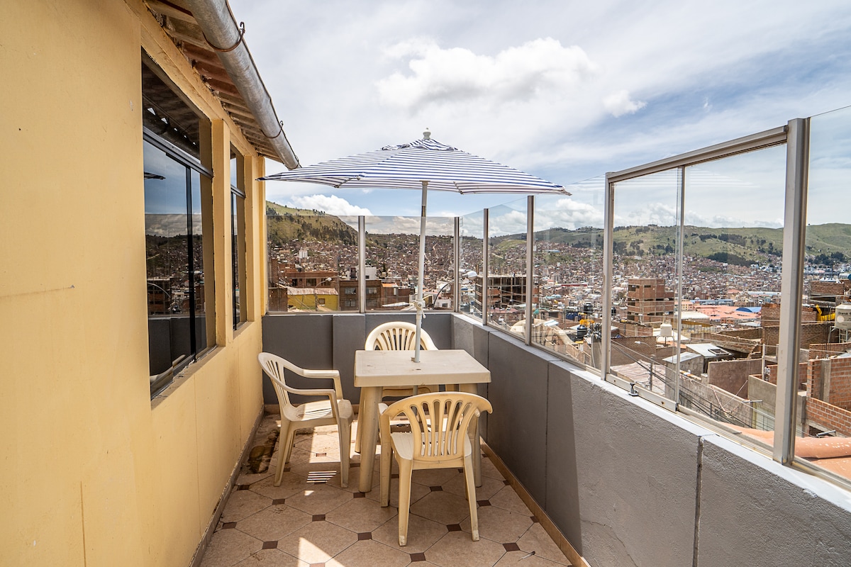 ನಾವು ಪೂನೋ ಡೌನ್ಟೌನ್ಗೆ (ಟ್ಯಾಕ್ಸಿ ಮೂಲಕ) 4 ನಿಮಿಷಗಳ ದೂರದಲ್ಲಿರುವ ಸುರಕ್ಷಿತ ಪ್ರದೇಶದಲ್ಲಿದ್ದೇವೆ, ನಗರ ಮತ್ತು ಇಂಕಾಸ್ನ ಪವಿತ್ರ ಸರೋವರದ ಅಸಾಧಾರಣ ನೋಟವನ್ನು ಹೊಂದಿದ್ದೇವೆ. ಎಲ್ಲಾ ರೂಮ್ಗಳು ಉತ್ತಮ ಮುಕ್ತಾಯವನ್ನು ಹೊಂದಿವೆ ಮತ್ತು ಎಲ್ಲಾ ರೀತಿಯ ಪ್ರಯಾಣಿಕರಿಗಾಗಿ ತಯಾರಿಸಲಾಗುತ್ತದೆ. ಟೆರೇಸ್ ಎತ್ತರದ ಪ್ರದೇಶಗಳ ಅದ್ಭುತ ನೋಟವನ್ನು ಹೊಂದಿದೆ, ಒಂದೇ ಚಿತ್ರದಲ್ಲಿ ನಗರ, ಆಕಾಶ ಮತ್ತು ಸರೋವರಕ್ಕೆ ಸೇರಿಕೊಳ್ಳಿ. ಪ್ರಕೃತಿ ಪ್ರಿಯರಿಗೆ ಸೂಕ್ತವಾಗಿದೆ. ನೀವು ಮನೆಯಿಂದ ದೂರದಲ್ಲಿರುವ ಮನೆಯಲ್ಲಿರುತ್ತೀರಿ. ಪ್ರವಾಸೋದ್ಯಮದಲ್ಲಿ ನಮ್ಮ ಅನುಭವವು ನಿಮ್ಮ ವಾಸ್ತವ್ಯವನ್ನು ಮರೆಯಲಾಗದಂತೆ ಮಾಡುತ್ತದೆ.