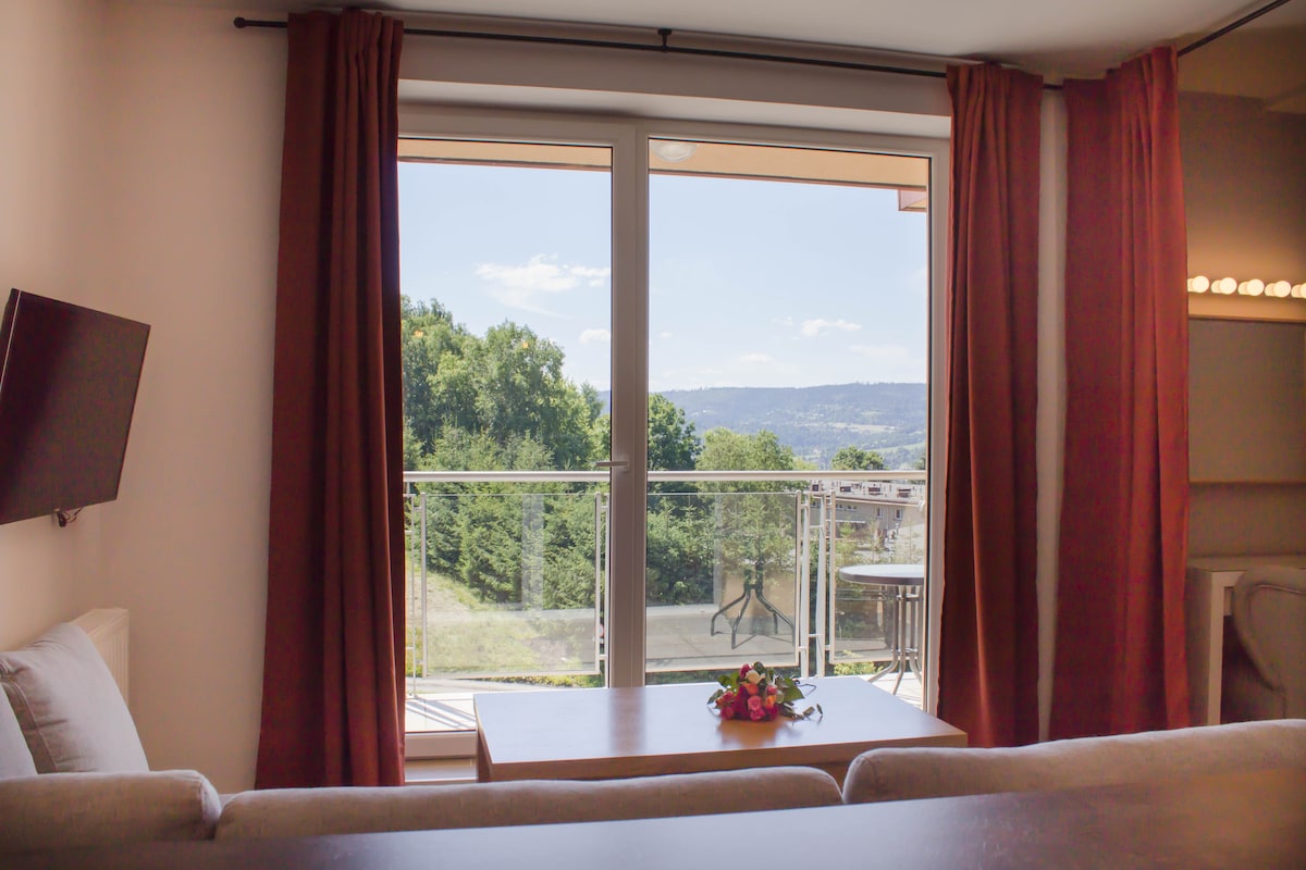 ಡಿಲಕ್ಸ್ ಎಂಬುದು ಎರಡು ಭಾಗಗಳಾಗಿ ವಿಂಗಡಿಸಲಾದ ವಿಶಿಷ್ಟ ಅಪಾರ್ಟ್ಮೆಂಟ್ ಆಗಿದೆ: ಲಿವಿಂಗ್ ರೂಮ್ ಮತ್ತು ಮಲಗುವ ಕೋಣೆ ಹೊಂದಿರುವ ಡೈನಿಂಗ್ ರೂಮ್ ಹೊಂದಿರುವ ಅಡುಗೆಮನೆ. ಈ ಲೇಔಟ್ ಪರಿಪೂರ್ಣ ವಿಹಾರಕ್ಕೆ ಸ್ಥಳವನ್ನು ಸೃಷ್ಟಿಸುತ್ತದೆ. ಅಪಾರ್ಟ್ಮೆಂಟ್ ಅನ್ನು ವಿಶೇಷವಾಗಿಸಲು ಕಾರಣವೇನು? ಬೆಡ್ರೂಮ್ನಲ್ಲಿ, ಇದು 180x200 ಪರ್ವತ ಹೈಕಿಂಗ್ ಖಾತರಿಯ ಹಾಸಿಗೆಯಾಗಿದೆ. ಲಿವಿಂಗ್ ರೂಮ್ನಲ್ಲಿ – ಸಂಜೆ ಹೋಮ್ ಥಿಯೇಟರ್ ಪಾತ್ರವನ್ನು ವಹಿಸುವಂತೆ ಮಾಡುವ ಸೌಂಡ್ಬಾರ್. ವಿಹಂಗಮ ಕಿಟಕಿಗಳು ಈ ಬಾರಿ ಪ್ರಕೃತಿಯ ಅದ್ಭುತವಾಗಿದೆ, ಇದನ್ನು ನೀವು ಮಿತಿಯಿಲ್ಲದೆ ಆನಂದಿಸಬಹುದು.