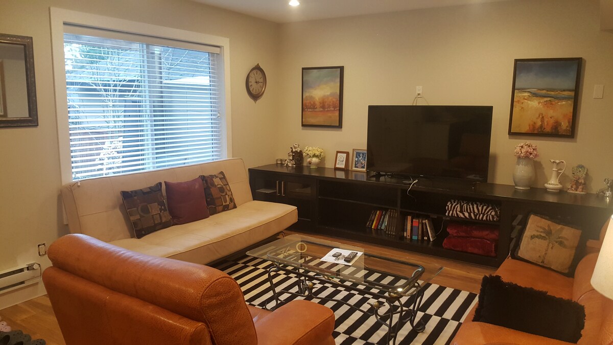 Clean & cozy 1 bedroom with seperate entrance and spacious backyard. Fully furnished with 1 queen size bed, fully stocked kitchen, insuite washer & dryer. Property backs onto a creek & Burnaby Mountain's greenbelt. Loads of walking & biking trails that links you directly to SFU & Barnet marine park. Only 7-8 minutes walk to Burquitlam SkyTrain & Safeway; 5 min drive to Lougheed mall, food & Korean market. Also, easy access to hwy #1 via Gagliardi exit. Inquire for longer stays.