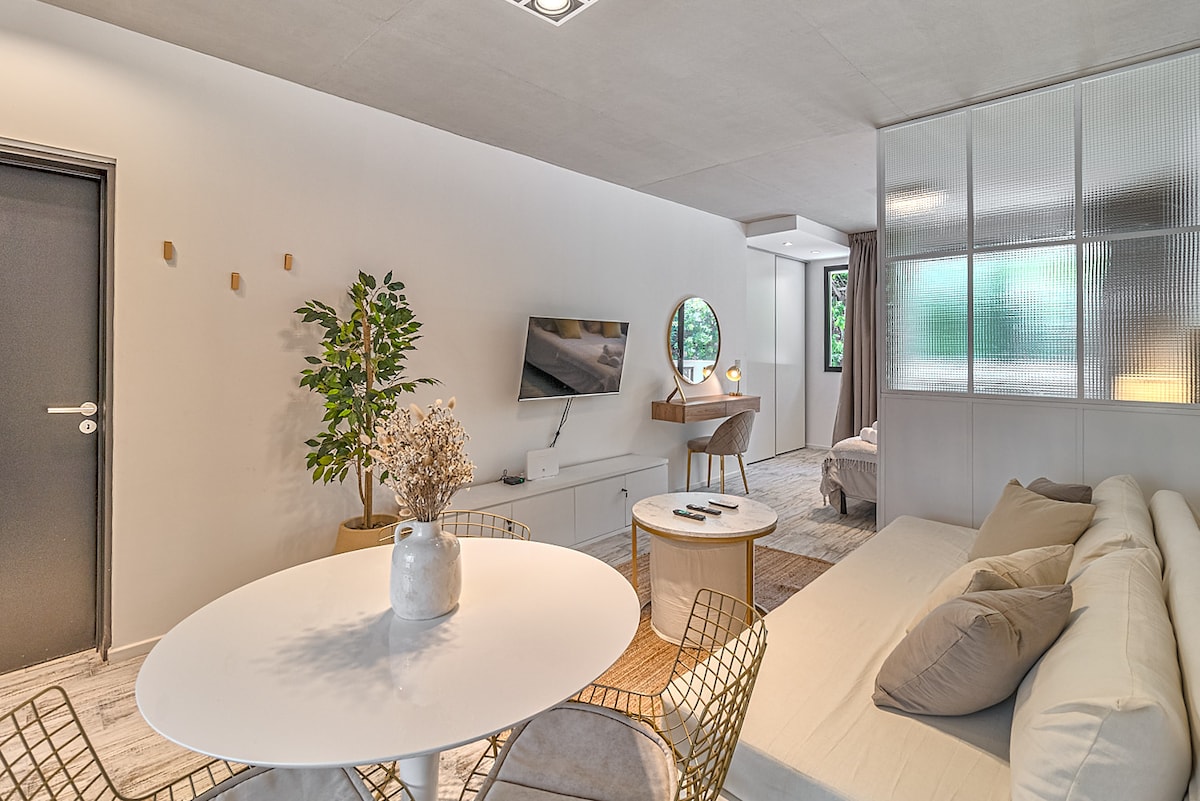 ಅಪಾರ್ಟ್ಮೆಂಟ್ ಅನ್ನು ಆರಾಮಕ್ಕೆ ಅನುಗುಣವಾಗಿ ಕಲೆ ಮತ್ತು ವಿನ್ಯಾಸದ ಸ್ಥಳವಾಗಿ ಕಲ್ಪಿಸಲಾಗಿದೆ, ಅಲ್ಲಿ ಸಮಕಾಲೀನರು ಕೆಲವು ವಸ್ತುಗಳು ಮತ್ತು ಪೀಠೋಪಕರಣಗಳ ಶೈಲಿಯಲ್ಲಿ ಭೂತಕಾಲಕ್ಕೆ ಸೂಕ್ಷ್ಮ ನೋಟವನ್ನು ನೀಡುತ್ತಾರೆ. ಅಪಾರ್ಟ್ಮೆಂಟ್ ಚಿಕ್ಕದಾಗಿದೆ (40 ಮೀ 2) ಆದರೆ ಬಿಳಿ ಮಹಡಿ, ಗೋಡೆಗಳು ಮತ್ತು ಸೀಲಿಂಗ್, ಬಾಲ್ಕನಿಯನ್ನು ಎದುರಿಸುತ್ತಿರುವ ದೊಡ್ಡ ಗೋಡೆಯ ಕನ್ನಡಿಯೊಂದಿಗೆ, ಪ್ರತಿ ಸ್ಥಳದ ಕ್ರಿಯಾತ್ಮಕ ಬಳಕೆಯೊಂದಿಗೆ ಬಲಪಡಿಸಲಾದ ವಿಶಾಲತೆಯ ಭಾವನೆಯನ್ನು ನೀಡುತ್ತದೆ. ಉಪಕರಣವು ಆಧುನಿಕವಾಗಿದೆ ಮತ್ತು ನೀವು ಮರೆಯಲಾಗದ ದಿನಗಳನ್ನು ಕಳೆಯಬೇಕಾದ ಎಲ್ಲವನ್ನೂ ಸೇರಿಸಲಾಗಿದೆ.