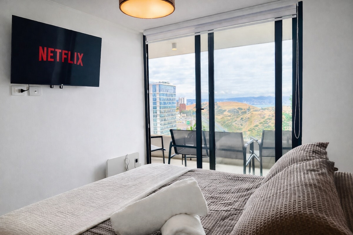 ವಿಶೇಷ ಕೋಸ್ಟಾಸ್ ಡಿ ಮಾಂಟೆಮಾರ್ ನೆರೆಹೊರೆಯಲ್ಲಿ ಸುಸಜ್ಜಿತ ಅಪಾರ್ಟ್ಮೆಂಟ್ ಆಗಿರುವ ಕಾನ್ಕಾನ್, ಮಾರ್ ಮತ್ತು ಬೇ ಆಫ್ ವಾಲ್ಪಾರೈಸೊದ ದಿಬ್ಬಗಳ ಅದ್ಭುತ ಸ್ಪಷ್ಟ ನೋಟ. ಇಂಟರ್ನೆಟ್ ಸಂಪರ್ಕ ಹೊಂದಿರುವ ಟಿವಿ, ವೈಫೈ, ನೆಟ್ಫ್ಲಿಕ್ಸ್. ತೆರೆಯಲು ಮಡಿಸುವ ಗಾಜಿನೊಂದಿಗೆ ಗೇಟೆಡ್ ಟೆರೇಸ್. 2 ಜನರಿಗೆ ಬೆಡ್ಶೀಟ್ಗಳು ಮತ್ತು ಸ್ನಾನದ ಟವೆಲ್ಗಳನ್ನು ಅಳವಡಿಸಲಾಗಿದೆ. ಖಾಸಗಿ ಪಾರ್ಕಿಂಗ್ ಭೂಗತ. ಕಟ್ಟಡವು ಹೊರಾಂಗಣ ಪೂಲ್, ಜಿಮ್ ರೂಮ್, ಜಿಮ್ ರೂಮ್, ಲಾಂಡ್ರಿ ರೂಮ್, ಲಾಂಡ್ರಿ, ಕ್ವಿಂಚೋಸ್ ಅನ್ನು ಹೊಂದಿದೆ. ವಾಣಿಜ್ಯ, ರೆಸ್ಟೋರೆಂಟ್ಗಳು, ಉದ್ಯಾನವನಗಳು ಮತ್ತು ಕಡಲತೀರಕ್ಕೆ ಹತ್ತಿರ.