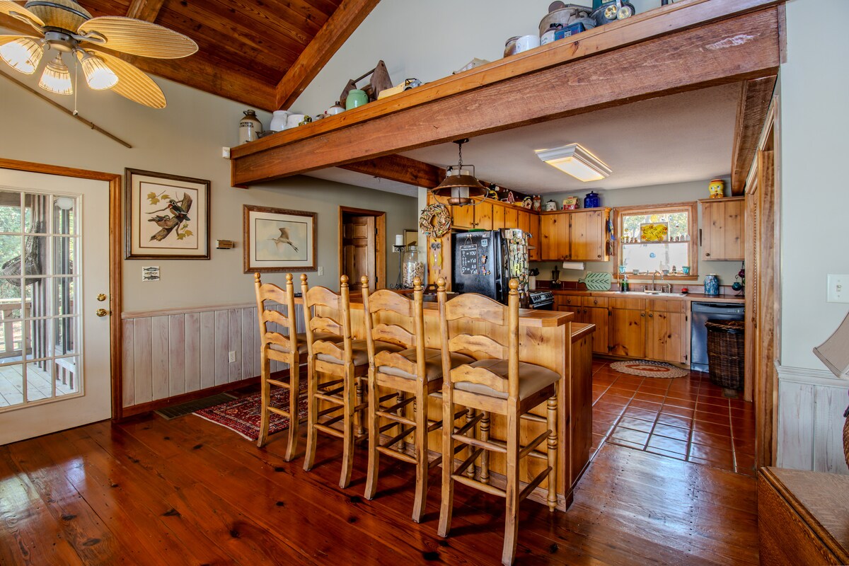 12 ಅಡಿ ಛಾವಣಿಗಳೊಂದಿಗೆ ಕಸ್ಟಮ್ ವಿನ್ಯಾಸಗೊಳಿಸಿದ ಲೇಕ್ಫ್ರಂಟ್ ಮನೆ, ಸರೋವರ ಮತ್ತು ಸೂರ್ಯಾಸ್ತಗಳ ಸುಂದರವಾದ ವೀಕ್ಷಣೆಗಳೊಂದಿಗೆ ದೊಡ್ಡ ಸ್ಕ್ರೀನ್ ಮಾಡಿದ ಮುಖಮಂಟಪ, ಹೊಸ ಗನೈಟ್ ಪೂಲ್, ಸನ್ ಡೆಕ್ ಮತ್ತು ಕವರ್ ಪ್ರದೇಶ ಹೊಂದಿರುವ ಡಾಕ್, ತೆರೆದ ನೆಲದ ಯೋಜನೆ, ಅನಿಲ ಅಗ್ಗಿಷ್ಟಿಕೆ, ಅಡುಗೆಮನೆ ಮತ್ತು ಸ್ನಾನಗೃಹಗಳಲ್ಲಿ ಉಪ್ಪಿನಕಾಯಿ ಹಾರ್ಟ್ ಪೈನ್ ಕ್ಯಾಬಿನೆಟ್ಗಳು, ಆಸನ ಹೊಂದಿರುವ ಪೆಕಿ ಸೈಪ್ರೆಸ್ ಕಿಚನ್ ದ್ವೀಪ, ವಾಕ್-ಇನ್ ಕ್ಲೋಸೆಟ್ಗಳು ಮತ್ತು ಪ್ರತಿ ಗೆಸ್ಟ್ ಗೌಪ್ಯತೆ ಮತ್ತು ಆರಾಮವನ್ನು ನೀಡುವ ಎನ್ ಸೂಟ್ ಐಷಾರಾಮಿ ಸ್ನಾನಗೃಹಗಳು, ಬೆರಗುಗೊಳಿಸುವ ವಾಸ್ತುಶಿಲ್ಪದ ವಿವರಗಳು ಮತ್ತು ಪೀಠೋಪಕರಣಗಳು, ಕಮಾನಿನ ಸೀಲಿಂಗ್, ಪ್ರಾಚೀನ ಕಿರಣಗಳು ಮತ್ತು ಮಾಸ್ಟರ್ ಬೆಡ್ರೂಮ್ನಲ್ಲಿ ಸೊಗಸಾದ ಫಿಕ್ಚರ್ಗಳು.
