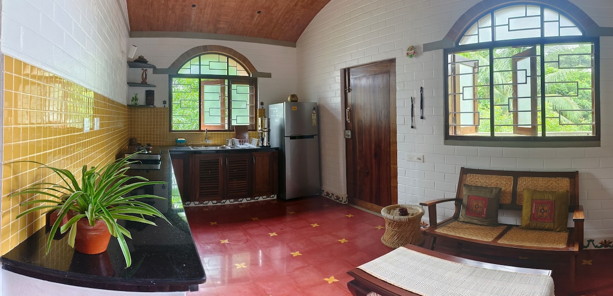 ಆರೊವಿಲ್ಲೆಯಲ್ಲಿರುವ ಮನೆಯಿಂದ ದೂರದಲ್ಲಿರುವ ನಿಮ್ಮ ಮನೆಯನ್ನು ಚೆಟ್ಟಿನಾಡ್ ಥೀಮ್ಗೆ ರುಚಿಯಾಗಿ ಅಲಂಕರಿಸಲಾಗಿದೆ. ನಮ್ಮ ಮನೆಯ ಪ್ರತಿಯೊಂದು ಮೂಲೆಯು ವರ್ಣರಂಜಿತ ಒಳಾಂಗಣಗಳು, ಕೋಲಂ ಕಲೆ, ಪ್ರಾಚೀನ ಅಲಂಕಾರ ಮತ್ತು ಹೆಚ್ಚಿನವುಗಳೊಂದಿಗೆ Instagram ಯೋಗ್ಯವಾಗಿದೆ. 1BHK ಲಿವಿಂಗ್ ರೂಮ್ನಲ್ಲಿ ಸ್ವಿಂಗ್ ಬೆಡ್ ಮತ್ತು ಸೋಫಾ ಹಾಸಿಗೆಯೊಂದಿಗೆ 4 ಜನರಿಗೆ ಆರಾಮವಾಗಿ ಅವಕಾಶ ಕಲ್ಪಿಸಬಹುದು. ಹತ್ತಿರದಲ್ಲಿ ಸಾಕಷ್ಟು ರೆಸ್ಟೋರೆಂಟ್ಗಳಿವೆ, ನಿಮ್ಮ ಎಲ್ಲಾ ಅಗತ್ಯಗಳಿಗಾಗಿ ನಮ್ಮ ಅಡುಗೆಮನೆಯನ್ನು ಚಿಂತನಶೀಲವಾಗಿ ಸಜ್ಜುಗೊಳಿಸಲಾಗಿದೆ - ತ್ವರಿತ ಆಮೆಲೆಟ್ ಅಥವಾ ಪೂರ್ಣ ಭಾರತೀಯ ಊಟವನ್ನು ತಯಾರಿಸುವುದು. ಆದ್ದರಿಂದ ಕುಳಿತುಕೊಳ್ಳಿ, ವಿಶ್ರಾಂತಿ ಪಡೆಯಿರಿ ಮತ್ತು ನಿಮ್ಮ ಕಾಫಿಯನ್ನು ಸಿಪ್ ಮಾಡಿ.