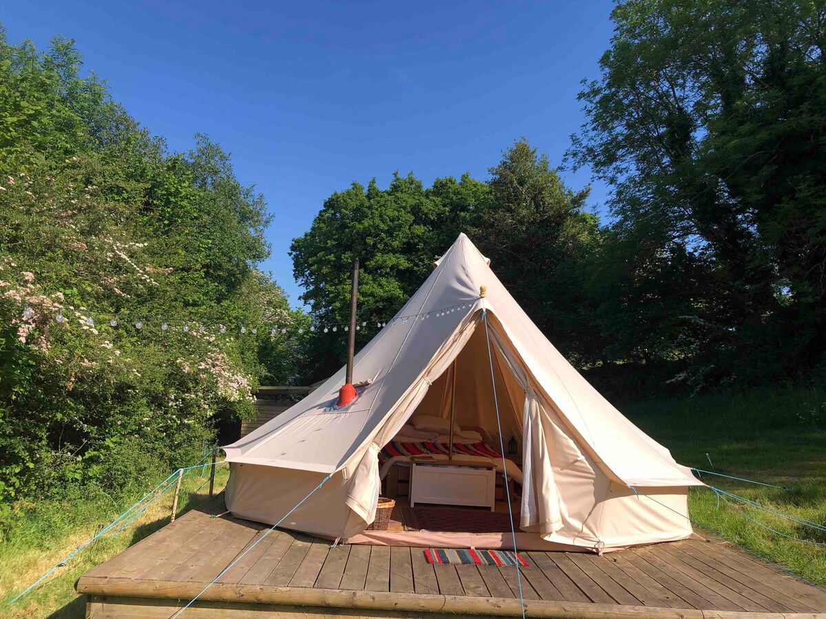ಆಪಲ್ ಟ್ರೀ ಬೆಲ್ ಟೆಂಟ್ ತನ್ನದೇ ಆದ ಎತ್ತರದ ಪ್ಲಾಟ್ಫಾರ್ಮ್ನಲ್ಲಿದೆ ಮತ್ತು ಎಕ್ಸೆ ಕಣಿವೆಯ ಮೇಲಿರುವ ಎಕ್ಮೌತ್ನಲ್ಲಿ ಸಮುದ್ರದಿಂದ ಸುತ್ತಮುತ್ತಲಿನ ಗ್ರಾಮಾಂತರದ ಅದ್ಭುತ ನೋಟಗಳನ್ನು ಹೊಂದಿದೆ. ವೀಕ್ಷಣೆಗಳು ಮತ್ತು ಆರಾಮದಾಯಕ ಮಲಗುವ ಸ್ಥಳದ ಜೊತೆಗೆ ಟೆಂಟ್ ತನ್ನದೇ ಆದ ಖಾಸಗಿ ಫೈರ್ ಪಿಟ್ ಮತ್ತು ಬೆಂಚುಗಳು ಮತ್ತು ಪಿಕ್ನಿಕ್ ಟೇಬಲ್ನೊಂದಿಗೆ ಹೊರಗಿನ ಅಡುಗೆ ಪ್ರದೇಶವನ್ನು ಹೊಂದಿದೆ. ಸನ್ರೈಸ್ ಕ್ಯಾಂಪಿಂಗ್ನಲ್ಲಿ ನಾವು ಹೊಂದಿರುವ 5 ಗ್ಲ್ಯಾಂಪಿಂಗ್ ಯುನಿಟ್ಗಳಲ್ಲಿ ಇದೂ ಒಂದು, ಇವೆಲ್ಲವನ್ನೂ ನಾವು ಗುಂಪು ಬುಕಿಂಗ್ಗಾಗಿ ನೀಡಬಹುದು. ದಯವಿಟ್ಟು ನಮಗೆ ಸಂದೇಶ ಕಳುಹಿಸಿ!