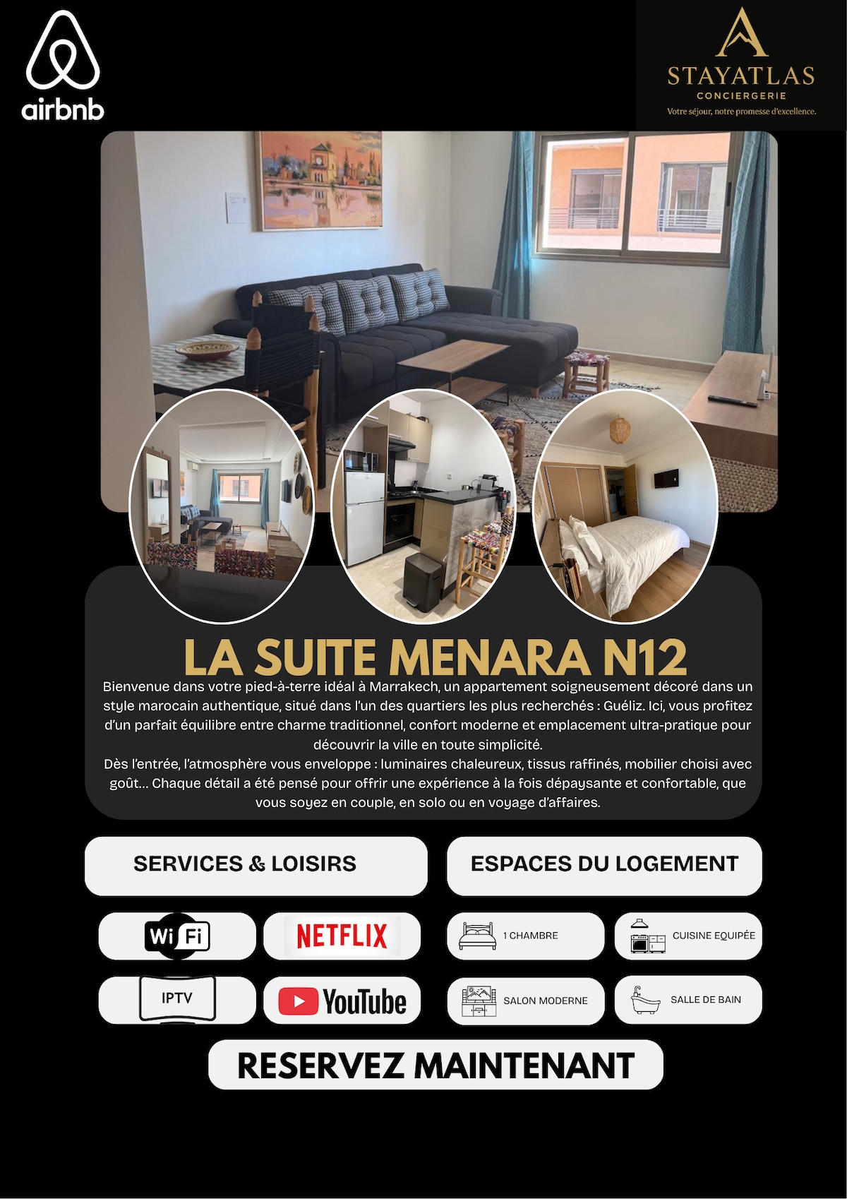 Bienvenue à La Suite Menara, un studio moderne au cœur de Marrakech, pensé pour les voyageurs qui aiment le confort, le style et l’authenticité marocaine. Entre zellige artisanal, matières nobles et touches contemporaines, l’ambiance est chaleureuse, lumineuse et raffinée. Après une journée dans la médina, profitez d’un espace calme et confortable pour vous détendre, travailler ou simplement savourer l’instant.