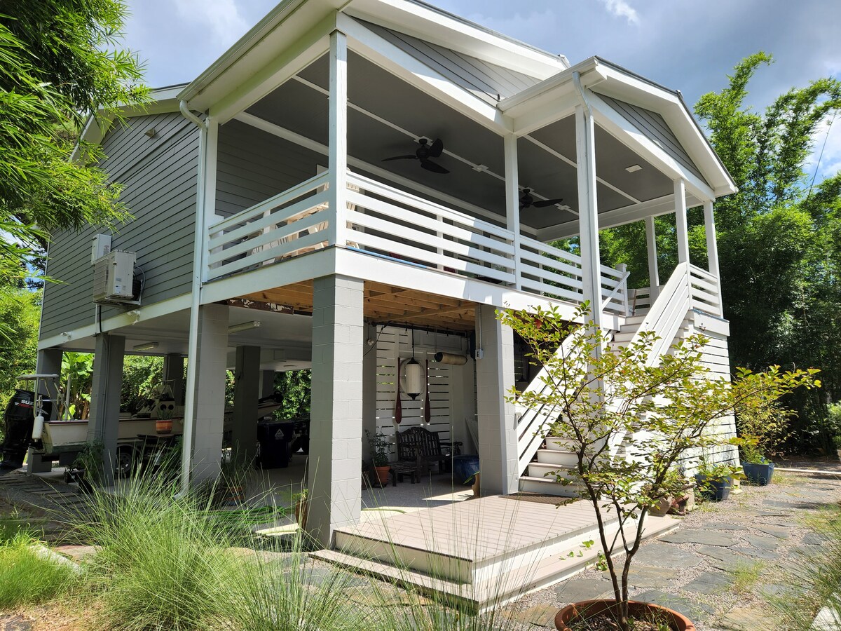 ನಾವು ಅದನ್ನು ಬೋಟ್ಹೌಸ್ ಎಂದು ಕರೆಯುತ್ತೇವೆ, ಆದರೆ ಅದನ್ನು ಟ್ರೀಹೌಸ್ ಎಂದು ಸುಲಭವಾಗಿ ಕರೆಯಬಹುದು. ಇದು ದೈತ್ಯ ಲೈವ್ ಓಕ್ ಮರಗಳ ನಡುವೆ ಉಬ್ಬರವಿಳಿತದ ಕೆರೆಯಿಂದ ಕೇವಲ ಅಡಿ ದೂರದಲ್ಲಿದೆ. ಬಾಗಿಲಿನ ಹೊರಗೆ ಒಂದು ಸಣ್ಣ ಡಾಕ್ ಇದೆ, ಆದ್ದರಿಂದ ನಿಮ್ಮ ಕಯಾಕ್ಗಳು ಅಥವಾ ಇತರ ಸಣ್ಣ ಕರಕುಶಲ ವಸ್ತುಗಳನ್ನು ತನ್ನಿ. ಆರಾಮದಾಯಕವಾಗಿದ್ದರೂ, ಇದು ಎಲ್ಲವನ್ನೂ ಸರಳ ಕಾಟೇಜ್ ನೀಡುತ್ತದೆ. ಕಡಲತೀರಗಳಂತೆ ಶೆಮ್ ಕ್ರೀಕ್ ನಿಮಿಷಗಳ ದೂರದಲ್ಲಿದೆ. ಪ್ಯಾಟ್ರಿಯಟ್ಸ್ ಪಾಯಿಂಟ್ ಮತ್ತು ಪಾರ್ಕ್ಗಳು ಸ್ವಲ್ಪ ದೂರದಲ್ಲಿವೆ. ಇದು ಚಾರ್ಲ್ಸ್ಟನ್ಗೆ ಅತ್ಯಂತ ಸಮೀಪದ ವಸತಿ ಪ್ರದೇಶವಾಗಿದ್ದು, ನೀವು ಇದನ್ನು ಮೌಂಟ್ ಪ್ಲೆಸೆಂಟ್ನಲ್ಲಿ ಕಾಣಬಹುದು. ST250324 BL20139655