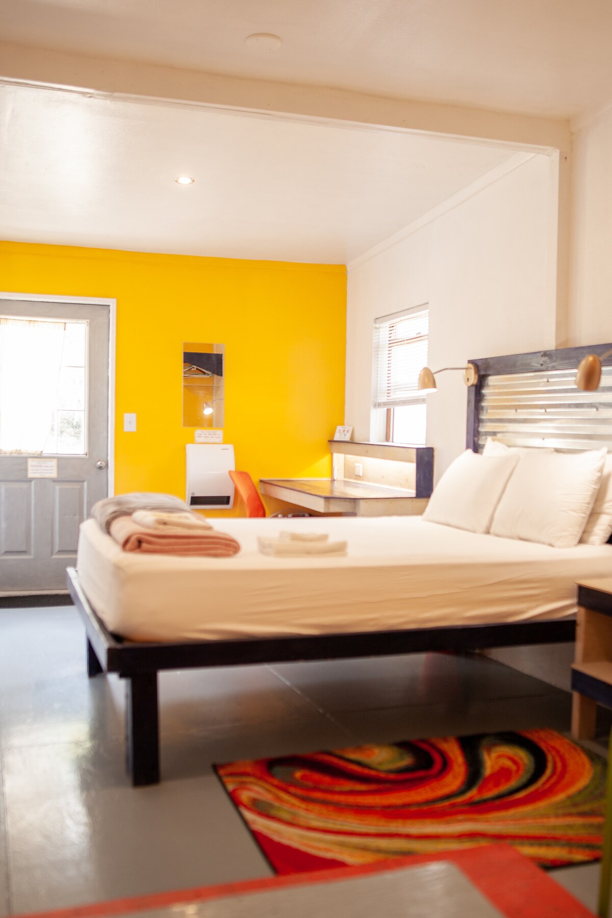 ಸಾಂಟಾ ಫೆ ಇಂಟರ್ನ್ಯಾಷನಲ್ ಹಾಸ್ಟೆಲ್ನಲ್ಲಿ ಸ್ವಾಗತಿಸಿ. ನಮ್ಮ ಅಧಿಕೃತ "ರೂಟ್ 66" ಯುಗದ ಮೋಟೆಲ್ನಲ್ಲಿರುವ ಈ ರೂಮ್, ರಾಣಿ ಹಾಸಿಗೆ ಮತ್ತು ತಂಪಾದ ನೀರಿನ ಸಿಂಕ್ ಎನ್-ಸೂಟ್ನೊಂದಿಗೆ 1/2 ಸ್ನಾನಗೃಹವನ್ನು ಹೊಂದಿದೆ. ಹಾದುಹೋಗುವ ಮಾರ್ಗದಲ್ಲಿ ಬಿಸಿನೀರಿನ ಶವರ್ ಲಭ್ಯವಿದೆ. ಸ್ಥಳೀಯ ಆರ್ಥಿಕತೆಯಲ್ಲಿ ಕೆಲಸ ಮಾಡುವವರನ್ನು ಹಾಸ್ಟೆಲ್ ಹೋಸ್ಟ್ ಮಾಡುವುದಿಲ್ಲ. ಬಾಗಿಲಿಗೆ ಸಿಟಿ ಬಸ್. ಅಲ್ಬುಕರ್ಕ್ ನಿಲ್ದಾಣದಿಂದ ಪ್ರಯಾಣಿಕರ ರೈಲು ಎರಡು ಬ್ಲಾಕ್ಗಳಾಗಿದೆ. ಸಾಂಟಾ ಫೆ ವಿಮಾನ ನಿಲ್ದಾಣವು ಪಟ್ಟಣಕ್ಕೆ ಸಾರ್ವಜನಿಕ ಸಾರಿಗೆಯನ್ನು ಹೊಂದಿಲ್ಲ.