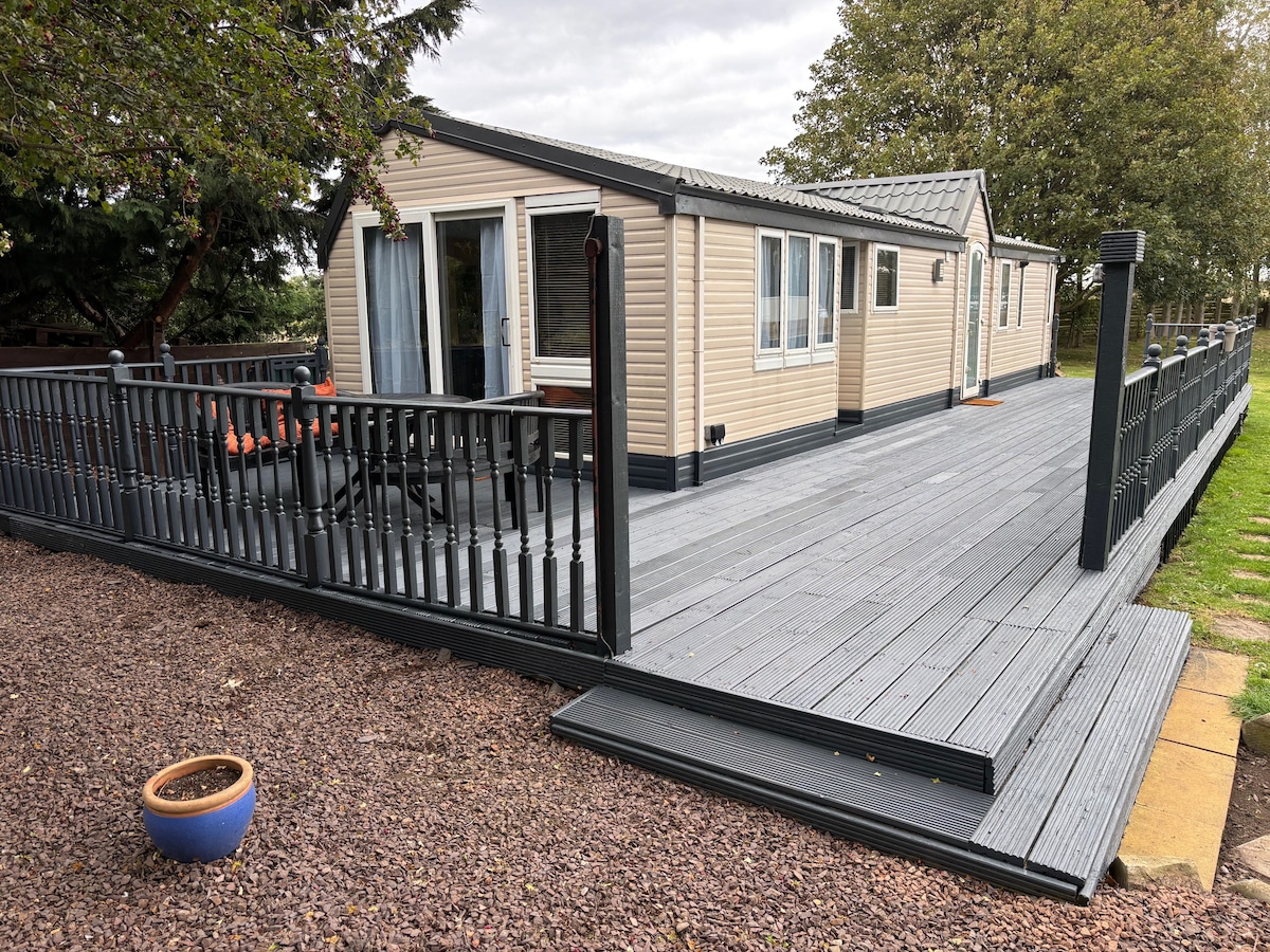 Quiet location Front and side decking Private parking Central heating 2 bedrooms En-Suite master bedroom with Bath Second twin bedroom Travel cot available on request Family shower room Fully equipped kitchen (American style fridge freezer, hob, oven, airfryer, microwave, toaster, coffee machine, starter tea, coffee and sugar, pots, pans etc) Dining table Lounge with sofa, fireplace, tv, Xbox, French doors leading onto front decking Board games, books and dvds Free wi-fi Towels Bed linen