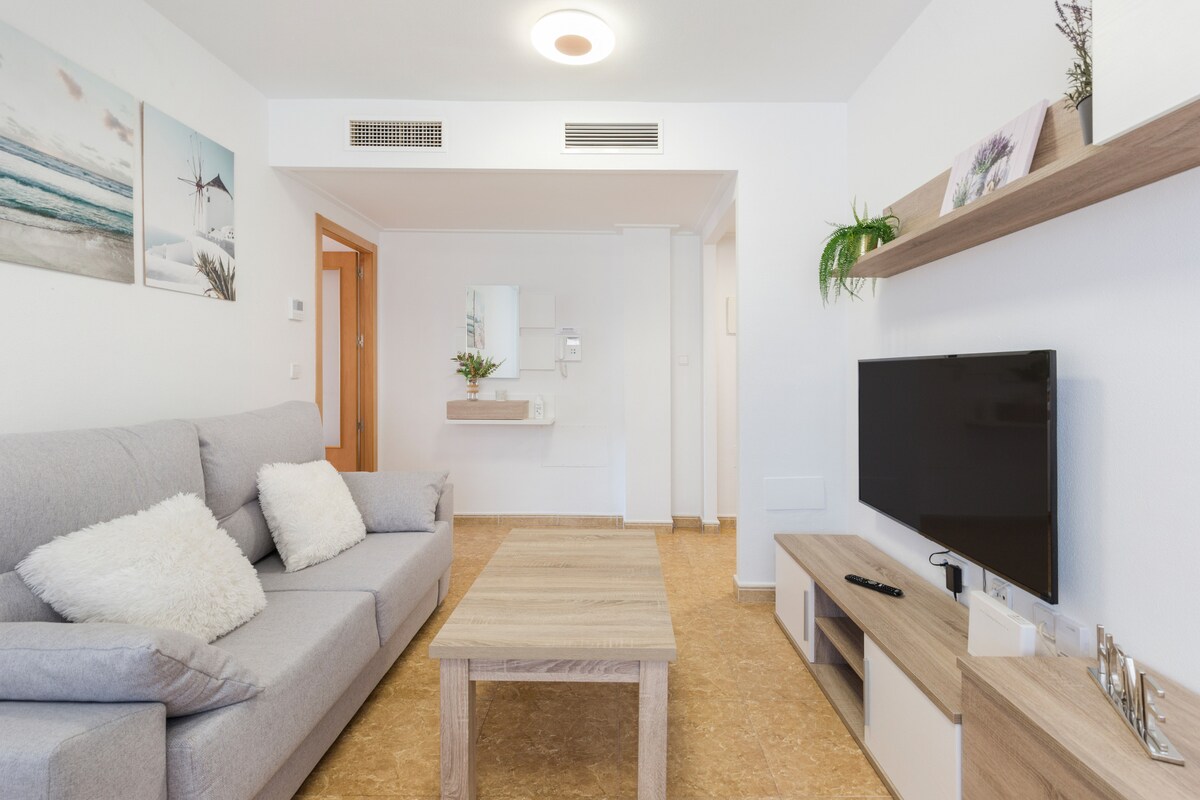 ಬಾಲ್ಕನಿಗಳನ್ನು ಹೊಂದಿರುವ ಸ್ಟೈಲಿಶ್ ಸಾಕುಪ್ರಾಣಿ ಸ್ನೇಹಿ 1 ಡಬಲ್ ಬೆಡ್ರೂಮ್ ಅಪಾರ್ಟ್ಮೆಂಟ್. ವೈಫೈ, ಸ್ಮಾರ್ಟ್ ಟಿವಿ ಮತ್ತು ಸಂಪೂರ್ಣವಾಗಿ ಕ್ರಿಯಾತ್ಮಕ ಅಡುಗೆಮನೆಯೊಂದಿಗೆ ಬೆಳಕು ಮತ್ತು ಗಾಳಿಯಾಡುವ ಸ್ಥಳ. ಸಮುದ್ರ ಮತ್ತು ಪರ್ವತ ವೀಕ್ಷಣೆಗಳು, ಸನ್ಬೆಡ್ಗಳನ್ನು ಹೊಂದಿರುವ ದೊಡ್ಡ ಖಾಸಗಿ ಬಳಕೆಯ ಸೌರಮಂಡಲ. ಸಾಮುದಾಯಿಕ ಪೂಲ್ ಬಳಕೆ. ಸ್ಥಳೀಯ ಬಾರ್ಗಳು, ಕಡಲತೀರಗಳು, ನಾಯಿ ಸ್ನೇಹಿ ಕಡಲತೀರ ಸುಮಾರು 600 ಮೀಟರ್ ದೂರದಲ್ಲಿವೆ. ವಿಶಿಷ್ಟವಾದ ಸ್ಪ್ಯಾನಿಷ್ ಕಡಲತೀರದ ಪ್ಯೂಬ್ಲೋದಲ್ಲಿ ನೆಲೆಗೊಂಡಿದೆ. ವಾಕಿಂಗ್ ದೂರದಲ್ಲಿ ಪಾಸಿಯೊ ಮ್ಯಾರಿಟೈಮ್ ಡಿ ಪೋರ್ಟೊ ಡಿ ಮಜರಾನ್. ಬೇಸಿಗೆಯ ಜಲ ಕ್ರೀಡೆಗಳು ಲಭ್ಯವಿವೆ, ಕಡಲತೀರದ ಬಾರ್. ಐತಿಹಾಸಿಕ ಪಟ್ಟಣವಾದ ಕಾರ್ಟಜೆನಾ 50 ನಿಮಿಷಗಳ ಡ್ರೈವ್ ದೂರದಲ್ಲಿದೆ.