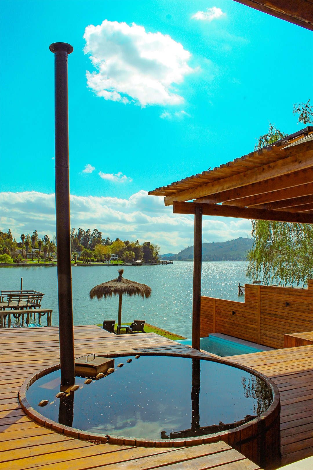 Casa flotante + quincho Cuenta con cocina, refrigerador, microondas, comedor, pieza para 2 personas, sillón cama, estacionada en un quincho con un mini jacuzzy de agua fría un juego de terraza todo a orilla de lago, la casa se encuentra sobre el lago. (el baño esta fuera de la casa flotante a unos 4 metros de ella) 4 personas Opción de 2 más con carpa en quincho (Ojo) La casa flotante está equipada con todo lo necesario para ser habitada, únicamente tienen que traer SABANAS Y TOALLAS.