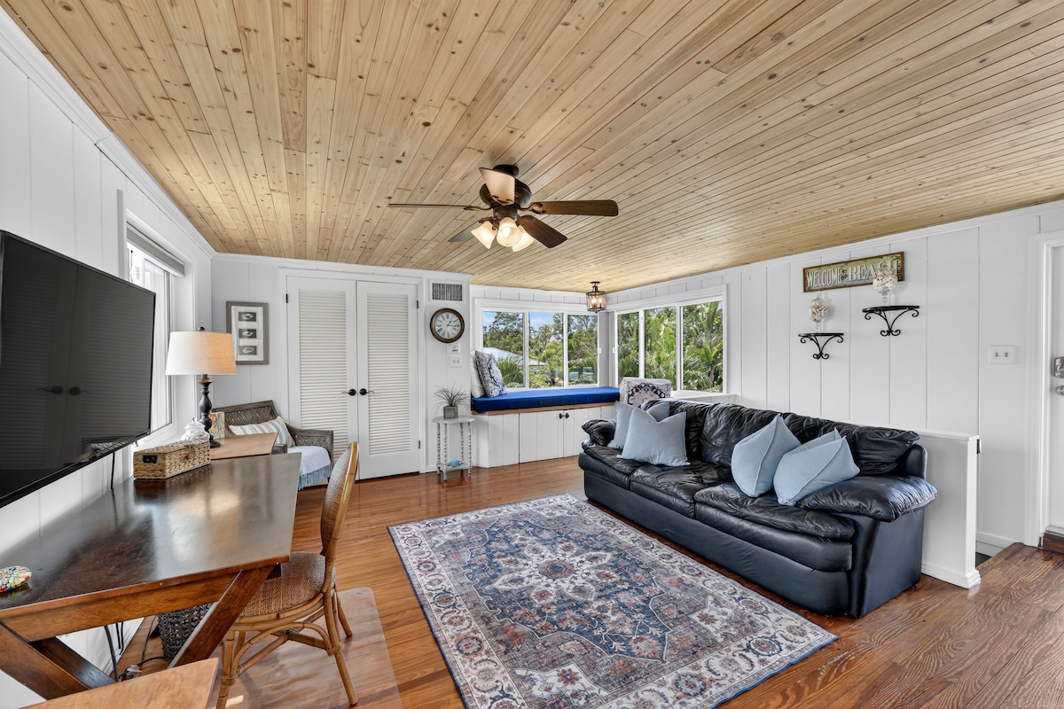 Cozy/Private 1+ Bedroom Private Waterfront Suite (King and Sleep Sofa) with Kitchen and Full Bath with the Beach literally 5 Steps from your Front Door. This rental is in a quiet residential neighborhood, further away from restaurants and bars. This property is one of the last remaining "Old Florida" regions of the Gulf Coast of Florida, with subtropical rainforest flora and fauna surrounding the property, a hammock waiting for you on the beach, and a dock for fishing or boating 100 yds away.