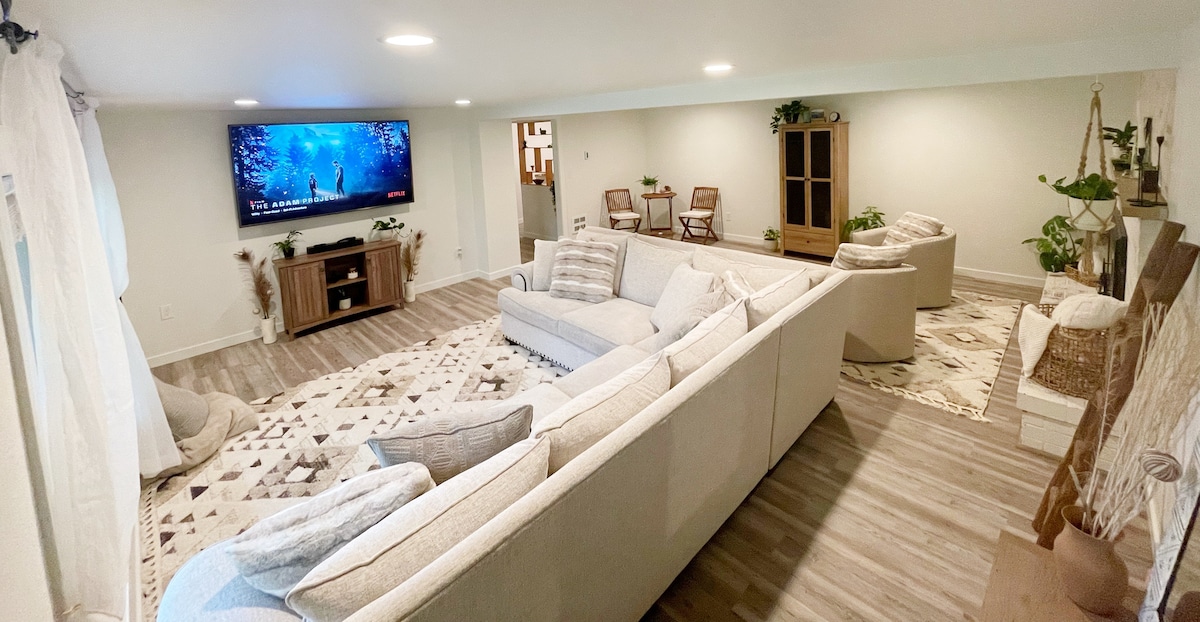 ಸ್ಯಾಮ್ಸಂಗ್ ಫ್ರೇಮ್ ಟಿವಿಯ ಕೆಳಗಿರುವ ರೇಖೀಯ ಅನಿಲ ಅಗ್ನಿಶಾಮಕದಳದ ಮೂಲಕ ವಿಭಾಗೀಯ ಸೋಫಾದಲ್ಲಿ ಫೈರ್ ಪಿಟ್ ಸುತ್ತಲೂ ಅಥವಾ ಒಳಗೆ ಅಂತರ್ನಿರ್ಮಿತ ಆಸನದಲ್ಲಿ ಬೆಂಕಿಯಿಂದ ಬೆಚ್ಚಗಾಗಿರಿ. ಒಳಗೆ ನೆಲದಿಂದ ಚಾವಣಿಯ ಕಿಟಕಿಗಳು, ವಿಕಿರಣ ನೆಲದ ತಾಪನ ಮತ್ತು ತೆರೆದ ಕಿರಣದ ಉಚ್ಚಾರಣೆಗಳಿವೆ. ಅಪಾರ್ಟ್ಮೆಂಟ್ ಐಷಾರಾಮಿ ವಾಕ್-ಇನ್ ಮಳೆ ಶವರ್ ಹೊಂದಿರುವ ಎರಡು ಬಾತ್ರೂಮ್ಗಳ ಜೊತೆಗೆ ಸುಸಜ್ಜಿತ ಅಡುಗೆಮನೆಯೊಂದಿಗೆ ಬೆರಗುಗೊಳಿಸುವ ತೆರೆದ ಯೋಜನೆ ವಾಸಿಸುವ ಸ್ಥಳವನ್ನು ಹೊಂದಿದೆ!