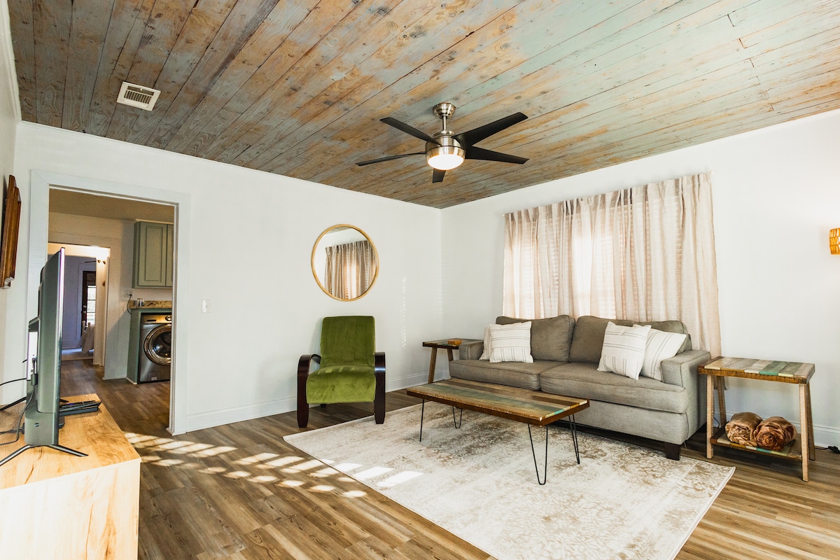 ಈ ಆರಾಮದಾಯಕ ಸಣ್ಣ ಮನೆಯ ಓಯಸಿಸ್ನ ಸಣ್ಣ ಮುಂಭಾಗದ ಮುಖಮಂಟಪದಲ್ಲಿ ಅಥವಾ ಬೇಲಿಯಿಂದ ಸುತ್ತುವರಿದ ಖಾಸಗಿ ಅಂಗಳದಲ್ಲಿ ವಿಶ್ರಾಂತಿ ಪಡೆಯಿರಿ. ಒಳಗೆ, ಆಹ್ವಾನಿಸುವ ಲಿವಿಂಗ್ ಪ್ರದೇಶವು ಆರಾಮದಾಯಕ ಮಂಚ ಮತ್ತು ದೊಡ್ಡ ಟಿವಿಯನ್ನು ಹೊಂದಿದೆ — ವಿಶ್ರಾಂತಿಗೆ ಸೂಕ್ತವಾಗಿದೆ. ಪೂರ್ಣ-ಗಾತ್ರದ ಈಟ್-ಇನ್ ಅಡುಗೆಮನೆಯು ಅಲ್ಪಾವಧಿ ಅಥವಾ ದೀರ್ಘಾವಧಿಯ ವಾಸ್ತವ್ಯಕ್ಕಾಗಿ ಊಟವನ್ನು ತಯಾರಿಸಲು ನಿಮಗೆ ಅಗತ್ಯವಿರುವ ಎಲ್ಲವನ್ನೂ ಒಳಗೊಂಡಿದೆ. ಮಲಗುವ ಕೋಣೆಯು ಪೂರ್ಣ ಗಾತ್ರದ ಹಾಸಿಗೆಯನ್ನು ನೀಡುತ್ತದೆ ಮತ್ತು ಸ್ನಾನಗೃಹವು ಸ್ಟ್ಯಾಂಡ್-ಅಪ್ ಶವರ್ ಅನ್ನು ಹೊಂದಿದೆ. ಹಕ್ಕುತ್ಯಾಗ: ಮಕ್ಕಳು ಹೊರಗೆ ಆಡುತ್ತಿರುವುದನ್ನು ಕೇಳಬಹುದು.