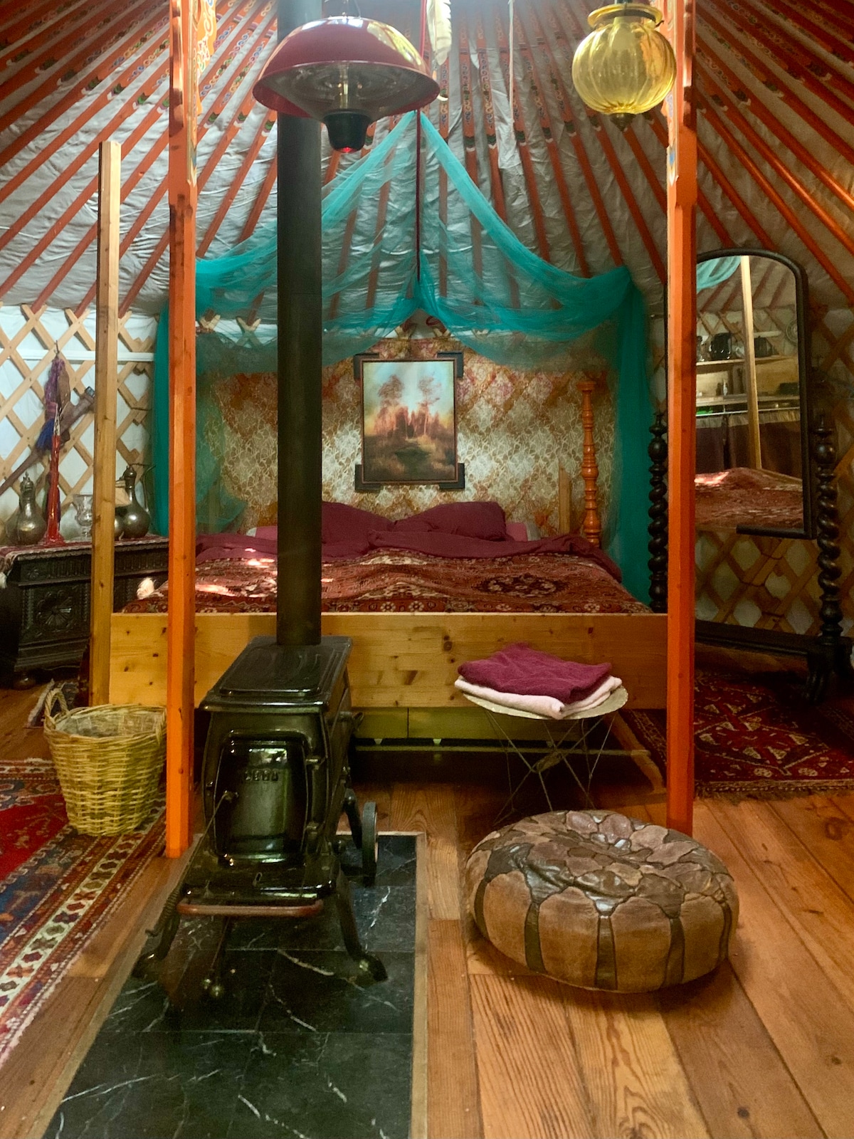 ಇಲ್ಲಿ ನೀವು ಶಾಂತಿ, ಸ್ಫೂರ್ತಿ ಮತ್ತು ದೈನಂದಿನ ಜೀವನದ ಹಸ್ಲ್ ಮತ್ತು ಗದ್ದಲದಿಂದ ವಿರಾಮವನ್ನು ಕಾಣುತ್ತೀರಿ. ನಮ್ಮ ಯರ್ಟ್ಟ್ ಅತ್ಯಂತ ಸುಂದರವಾದ ಪ್ರಕೃತಿಯಲ್ಲಿ 5 ಹೆಕ್ಟೇರ್ ಮಾಂತ್ರಿಕ ಉದ್ಯಾನವನದಲ್ಲಿ ನೆಲೆಗೊಂಡಿದೆ. ಕೊಳಗಳು, ಪ್ರಾಚೀನ ಮರಗಳು ಮತ್ತು ಆಕರ್ಷಕ ವನ್ಯಜೀವಿಗಳಿಂದ ಆವೃತವಾಗಿದೆ. ನಾಲ್ಕು ಆರಾಮದಾಯಕ ಬಾಕ್ಸ್-ಸ್ಪ್ರಿಂಗ್ ಹಾಸಿಗೆಗಳು ಆರಾಮದಾಯಕ ಮತ್ತು ಆರಾಮದಾಯಕ ರಾತ್ರಿಯ ನಿದ್ರೆಯನ್ನು ಖಚಿತಪಡಿಸುತ್ತವೆ. ಮರದ ಸುಡುವ ಸ್ಟೌವ್ ಆರಾಮದಾಯಕವಾದ ಉಷ್ಣತೆಯನ್ನು ಒದಗಿಸುತ್ತದೆ. ರೀಚಾರ್ಜ್ ಮಾಡಲು, ವಿಶ್ರಾಂತಿ ಪಡೆಯಲು ಅಥವಾ ನಿಮಗಾಗಿ ಸಮಯವನ್ನು ಹೊಂದಲು ನಿಮಗೆ ಸಹಾಯ ಮಾಡುವ ಅತ್ಯಂತ ವಿಶೇಷ ಸ್ಥಳ ಮತ್ತು ವೈಯಕ್ತಿಕ ರಿಟ್ರೀಟ್.