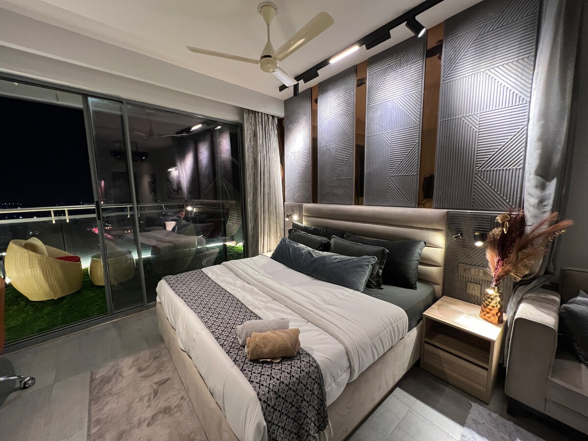 Welcome to this another luxurious property by Tulip Homes which is situated on 12th floor a High-rise building. Wide garden patio & 2 seater jacuzzi makes it unique in class. The place is perfect for relaxing and enjoying scenic view of modern architecture. Apartment is loaded with smart tv (all applications works), big mirror wall, a cozy double bed, comfy swing, stylish couch with central nesting coffee tables, fridge, microwave, induction,electric kettle, toaster, iron & many more.