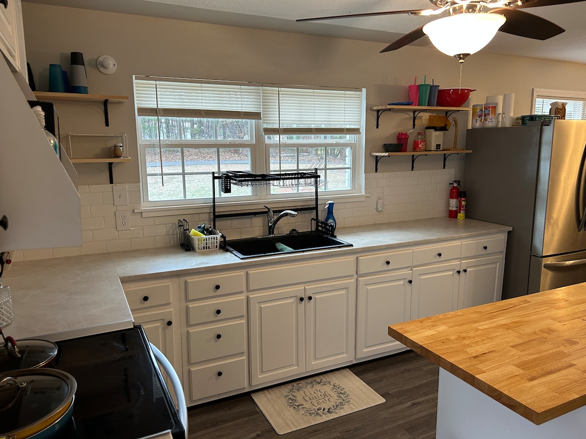 11 ಎಕರೆ ಫಾರ್ಮ್ಗೆ ಸುಸ್ವಾಗತ. ಸ್ನೇಹಶೀಲ 2 ಮಲಗುವ ಕೋಣೆ/2 ಸ್ನಾನದ ಮನೆ, ಪೂಲ್, ಕೊಳ + *ಬಾರ್ನ್ನ ಹೆಮ್ಮೆಪಡುವ ಶಾಂತಿಯುತ ಗ್ರಾಮೀಣ ಪರಿಸರದಲ್ಲಿ ನಿಮ್ಮ ಸಮಯವನ್ನು ಆನಂದಿಸಿ. ಮನೆಯು ಬಾರ್ ಸ್ಟೂಲ್ಗಳು + ಫಾರ್ಮ್ಹೌಸ್ ಟೇಬಲ್, ಕಚೇರಿ ಮೂಲೆ, ಅಗ್ಗಿಷ್ಟಿಕೆ ಬಳಿ ಕುಳಿತುಕೊಳ್ಳುವ ಪ್ರದೇಶ, ಲಿವಿಂಗ್ ರೂಮ್ + ಲಾಂಡ್ರಿ ರೂಮ್ನೊಂದಿಗೆ ಪೂರ್ಣ ಈಟ್-ಇನ್ ಅಡುಗೆಮನೆಯನ್ನು ನೀಡುತ್ತದೆ. ಕವರ್ ಮಾಡಿದ ಬ್ಯಾಕ್ ಡೆಕ್ ಲ್ಯಾಂಡ್ + ಉಪ್ಪು ನೀರಿನ ಪೂಲ್ ಅನ್ನು ಕಡೆಗಣಿಸುತ್ತದೆ, ಇದನ್ನು ವರ್ಷಪೂರ್ತಿ ನಿರ್ವಹಿಸಲಾಗುತ್ತದೆ ಆದರೆ ಬಿಸಿ ಮಾಡಲಾಗುವುದಿಲ್ಲ. ಪೂಲ್ ಮೂಲಕ 1/2 ಸ್ನಾನ. ಕೊಳದಲ್ಲಿ ಮೀನುಗಾರಿಕೆ ಸ್ವಾಗತವನ್ನು ಸೆರೆಹಿಡಿಯಿರಿ ಮತ್ತು ಬಿಡುಗಡೆ ಮಾಡಿ! ವಿಶ್ರಾಂತಿ ಮತ್ತು ವಿಶ್ರಾಂತಿ ಕೇವಲ ಒಂದು ಬುಕಿಂಗ್ ದೂರದಲ್ಲಿದೆ!