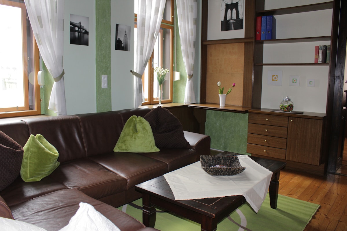 ಮಧ್ಯದ ಬಳಿ ಬಾಲ್ಕನಿಯನ್ನು ಹೊಂದಿರುವ ಅಪಾರ್ಟ್ಮೆಂಟ್ 100 m² (ಹಳೆಯ ಪಟ್ಟಣಕ್ಕೆ 900 ಮೀ, ರೈಲು ನಿಲ್ದಾಣಕ್ಕೆ 1100 ಮೀ) ಆಂಟೆರೂಮ್, ಅಡುಗೆಮನೆ , ಸ್ನಾನಗೃಹ/ ಶೌಚಾಲಯ, ಲಿವಿಂಗ್ ರೂಮ್, 1 ಸಿಂಗಲ್ ಬೆಡ್, ಡಬಲ್ ಬೆಡ್ ಹೊಂದಿರುವ 1 ಡಬಲ್ ಬೆಡ್ರೂಮ್, ಡಬಲ್ ಬೆಡ್ ಮತ್ತು ಸಿಂಗಲ್ ಬೆಡ್ ಹೊಂದಿರುವ 1 ಟ್ರಿಪಲ್ ರೂಮ್. ದುರದೃಷ್ಟವಶಾತ್ ಬಾತ್ರೂಮ್ ತುಂಬಾ ದೊಡ್ಡದಲ್ಲ.
