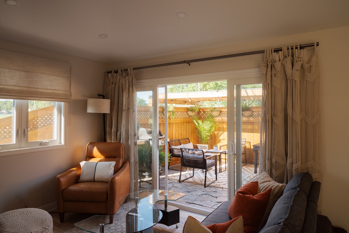 Welcome to Windsor’s hidden gem. This modern 2-bedroom retreat features a sunken living room, soaring patio doors, and a heated pool steps away. The pool is open year-round at 70°F; warmer settings available for an additional cost. The main floor offers an open layout with a sleek kitchen and tree-top terrace. Upstairs, unwind in a spa-inspired bedroom with a soaker tub, rainfall shower, and rooftop retreat. Two private terraces and unforgettable design, complete the experience.