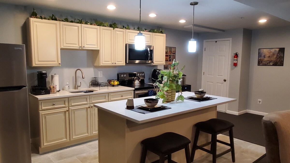 ಇದು ಹೊಸದಾಗಿ ನಿರ್ಮಿಸಲಾದ ಮನೆಯ ವಿಶಾಲವಾದ ಕೆಳಮಟ್ಟವಾಗಿದೆ. ಈ ಖಾಸಗಿ ಗೆಸ್ಟ್ ಪ್ರದೇಶವು ಮಲಗುವ ಕೋಣೆ ಮತ್ತು ಬಾತ್ರೂಮ್ ಜೊತೆಗೆ ಲೌಂಜ್, ಡಿನ್ನಿಂಗ್ ಮತ್ತು ಅಡಿಗೆಮನೆಯನ್ನು ಹೊಂದಿದೆ. ಗೆಸ್ಟ್ಗಳು ಟೌನ್ಹೌಸ್ನ ಮುಖ್ಯ ಪ್ರವೇಶದ್ವಾರವನ್ನು ಮಾತ್ರ ಮಹಡಿಯಲ್ಲಿ ವಾಸಿಸುವ ಮಾಲೀಕರೊಂದಿಗೆ ಹಂಚಿಕೊಳ್ಳುತ್ತಾರೆ. ಈ ಖಾಸಗಿ ಅಲಂಕೃತ ಸ್ಥಳವು ಸ್ಮಾರ್ಟ್ ಟಿವಿ, ಆರಾಮದಾಯಕ ಆಸನ, 4 ಕ್ಕೆ ಊಟ, ಮೈಕ್ರೊವೇವ್, ಕಾಫಿ ಮೇಕರ್, ಪೂರ್ಣ ರೆಫ್ರಿಜರೇಟರ್, ಟೋಸ್ಟರ್/ಏರ್ ಫ್ರೈಯರ್, ಕ್ವೀನ್ ಬೆಡ್, ವಾರ್ಡ್ರೋಬ್ ಮತ್ತು ಡ್ರೆಸ್ಸರ್ ಅನ್ನು ಒಳಗೊಂಡಿದೆ. ವಿನಂತಿಯ ಮೇರೆಗೆ ವಾಷರ್/ಡ್ರೈಯರ್ ಲಭ್ಯವಿದೆ. ಬುಕಿಂಗ್ ಮಾಡುವ ಮೊದಲು ದಯವಿಟ್ಟು ಮನೆಯ ನಿಯಮಗಳನ್ನು ಪರಿಶೀಲಿಸಿ