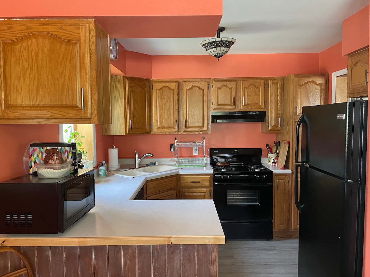 ಖಾಸಗಿ ಗೆಸ್ಟ್ ಹೌಸ್ ಅನ್ನು ಹೊಸದಾಗಿ ನವೀಕರಿಸಲಾಗಿದೆ. ಮೈಕ್ರೊವೇವ್ ಮತ್ತು ಕ್ಯೂರಿಗ್ ಕಾಫಿ ಮೇಕರ್ ಪಾಡ್ಗಳು, ಫ್ಯಾಮಿಲಿ ರೂಮ್ ಟಿವಿ ಮತ್ತು ವೈಫೈ ಸೇರಿದಂತೆ ಒಂದು ಬೆಡ್ರೂಮ್ ಕ್ವೀನ್ ಬೆಡ್, ಸ್ನಾನದ ಕೋಣೆ/ಶವರ್, ಪೂರ್ಣ ಅಡುಗೆಮನೆ ಸಂಗ್ರಹಿಸಲಾಗಿದೆ. ನೀವು ಕೆಲಸ, ಕ್ರೀಡಾ ಸ್ಪರ್ಧೆ, ಕುಟುಂಬ ಅಥವಾ ರಜಾದಿನಗಳಿಗಾಗಿ ಪಟ್ಟಣದಲ್ಲಿದ್ದರೂ ನಾವು ಮನೆಯ ಎಲ್ಲಾ ಸೌಕರ್ಯಗಳನ್ನು ನೀಡುತ್ತೇವೆ. ವಿನಂತಿಯ ಮೇರೆಗೆ ಏರ್ ಮ್ಯಾಟ್ರೆಸ್ ಲಭ್ಯವಿದೆ. ದಯವಿಟ್ಟು ನಿಮ್ಮ ಸ್ವಂತ ಮನೆಯಂತೆ ಪರಿಗಣಿಸಿ, ಎಲ್ಲಾ ಮನೆಯ ನಿಯಮಗಳನ್ನು ಅನುಸರಿಸಿ. ಯಾವುದೇ ಪಾರ್ಟಿ ಅಥವಾ ಕೂಟಗಳಿಲ್ಲ. ಇದು ಧೂಮಪಾನ ಮಾಡದ ಮನೆ.