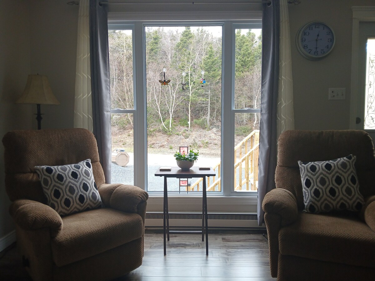 ನಾವು ನಮ್ಮ ಮನೆಯಲ್ಲಿ ನಂತರದ ಮತ್ತು ವಾಸಿಸುವ ಪ್ರದೇಶವನ್ನು ಹೊಂದಿರುವ ಮಲಗುವ ಕೋಣೆ ಹೊಂದಿರುವ ಖಾಸಗಿ ನೆಲಮಟ್ಟದ ಸ್ಥಳವನ್ನು ನೀಡುತ್ತೇವೆ. ಲಘು ತಿಂಡಿಗಳಿಗಾಗಿ ನಾವು ಫ್ರಿಜ್, ಮೈಕ್ರೊವೇವ್ ಮತ್ತು ಕಾಫಿ ಮೇಕರ್ ಅನ್ನು ಸಹ ಹೊಂದಿದ್ದೇವೆ. ನೀವು ಪ್ರತಿ ಕಿಟಕಿಯಿಂದ ಸಮುದ್ರದ ಅದ್ಭುತ ನೋಟವನ್ನು ಆನಂದಿಸುತ್ತೀರಿ. ಕಡಲತೀರವು ಮೆಟ್ಟಿಲುಗಳಷ್ಟು ದೂರದಲ್ಲಿರುವುದರಿಂದ, ಐಸ್ಬರ್ಗ್ಗಳು, ತಿಮಿಂಗಿಲಗಳು ಮತ್ತು ವನ್ಯಜೀವಿಗಳನ್ನು ಕಾಣಬಹುದು. ನೀವು ಕ್ಯಾಂಪ್ಫೈರ್ ಹೊಂದಿರುವುದನ್ನು ಸಹ ಆನಂದಿಸಬಹುದು. ಹೈಕಿಂಗ್ ಟ್ರೇಲ್ಗಳು ಸಹ ಹತ್ತಿರದಲ್ಲಿವೆ.