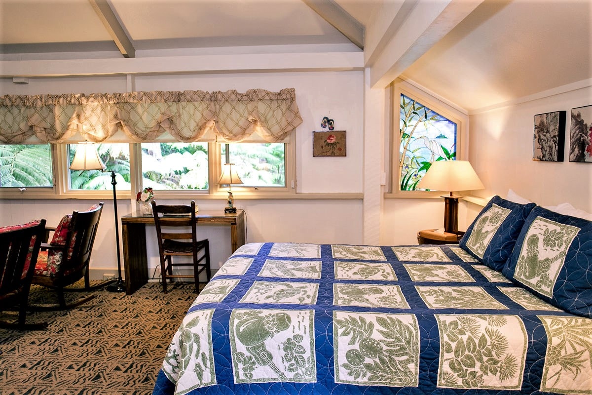 The Kimura Room, located upstairs at the Kilauea Lodge in the Hale Maluna building, features a queen bed, private bath, heated towel warmer, bathrobes, gas fireplace, and central heat. Built in 1937 as part of the YMCA Lodge, the two story Hale Maluna building has four guest rooms. Can accommodate up to 2 guests.