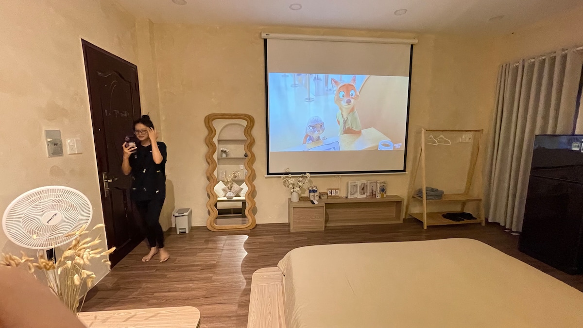 Căn hộ hiện đại, ấm cúng với thiết kế tối giản và đầy đủ tiện nghi (1 trệt và 1 lầu). Phòng khách với sofa đỏ nổi bật, bàn trà nhỏ xinh và TV, kết hợp với bếp gỗ sang trọng, đầy đủ dụng cụ nấu ăn, tủ lạnh và bếp điện. Khu vực ăn uống ấm áp với bàn ghế gỗ cho 4 người. 2 phòng ngủ rộng rãi, ánh sáng tự nhiên chan hòa, giường êm ái và máy chiếu tiện lợi để thư giãn. Đây là không gian lý tưởng cho kỳ nghỉ thoải mái, gần sân bay Tân Sân Nhất, phù hợp gia đình hoặc nhóm bạn.