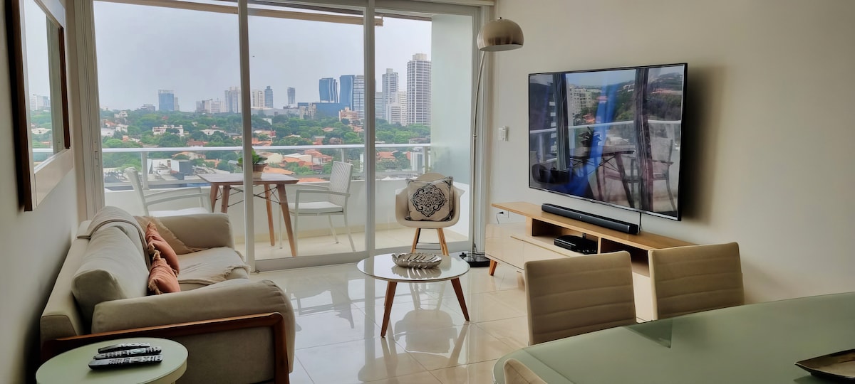 Exclusivo departamento en el último, 16vo piso con terraza privada. Excelente ubicación en la zona vip residencial de Asunción. Terraza privada con parrilla, comedor exterior para 8 personas y área de estar. Vista panorámica de la ciudad y atardecer en la Bahía. Cuenta con un dormitorio matrimonial súper king en suite con TV Smart y servicio de TV Cable. Otra habitación doble en suite, y una habitación pequeña con sofá cama, que cuenta solo con ventilador y baño enfrente.