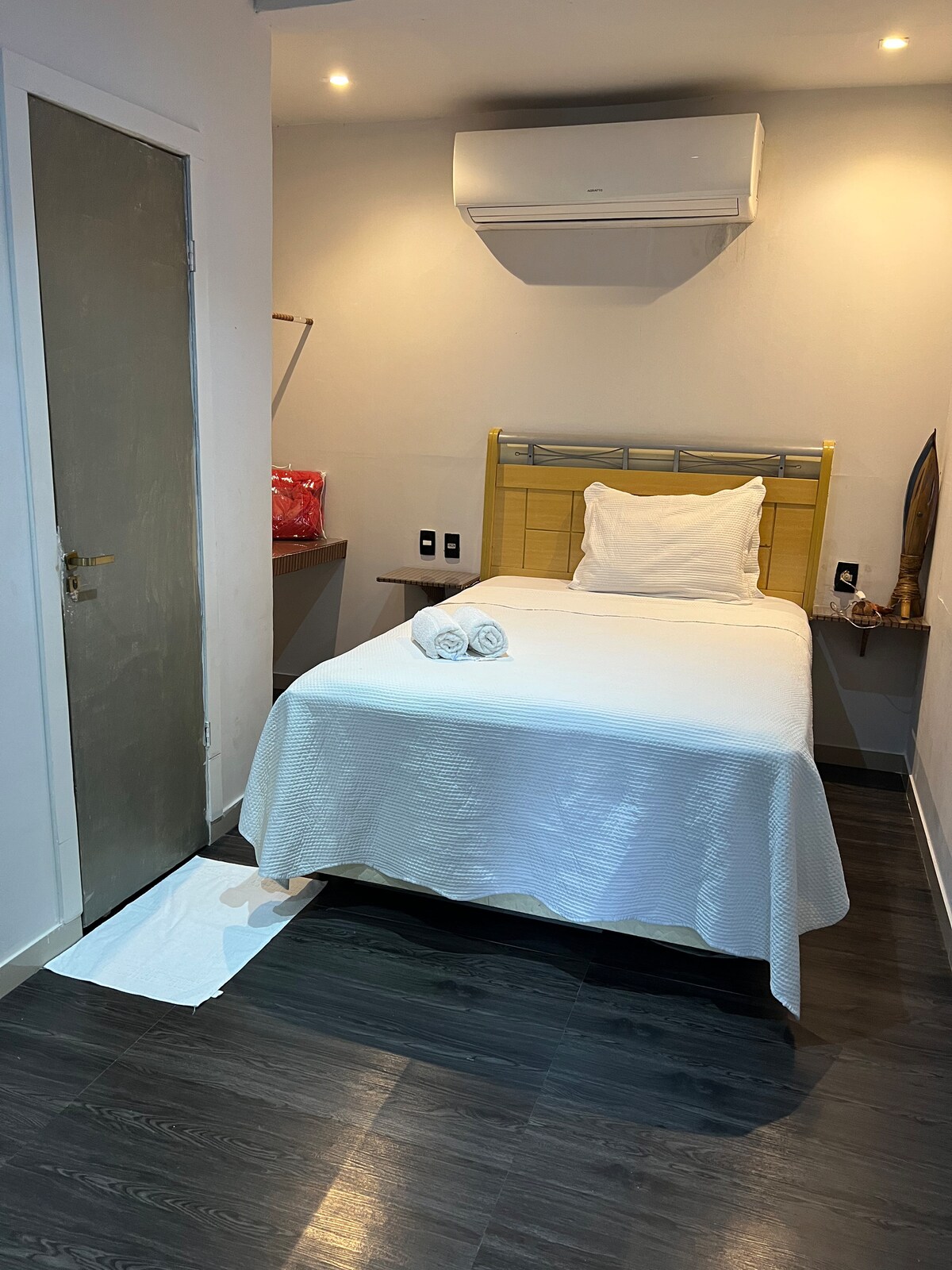 O quarto dispõe de cama, ar-condicionado inverter quente e frio de 12.000 BTUs, Wi-Fi e TV de 32 polegadas. Oferece kit higiene para pernoites e diárias, café disponível para pernoite e diária, chuveiro com três modos de temperatura, cobertas e toalhas, mesa para refeições, espaço para cama extra, sistema Trio Way no quarto (não é necessário levantar para desligar a luz) e armário móvel com arara.