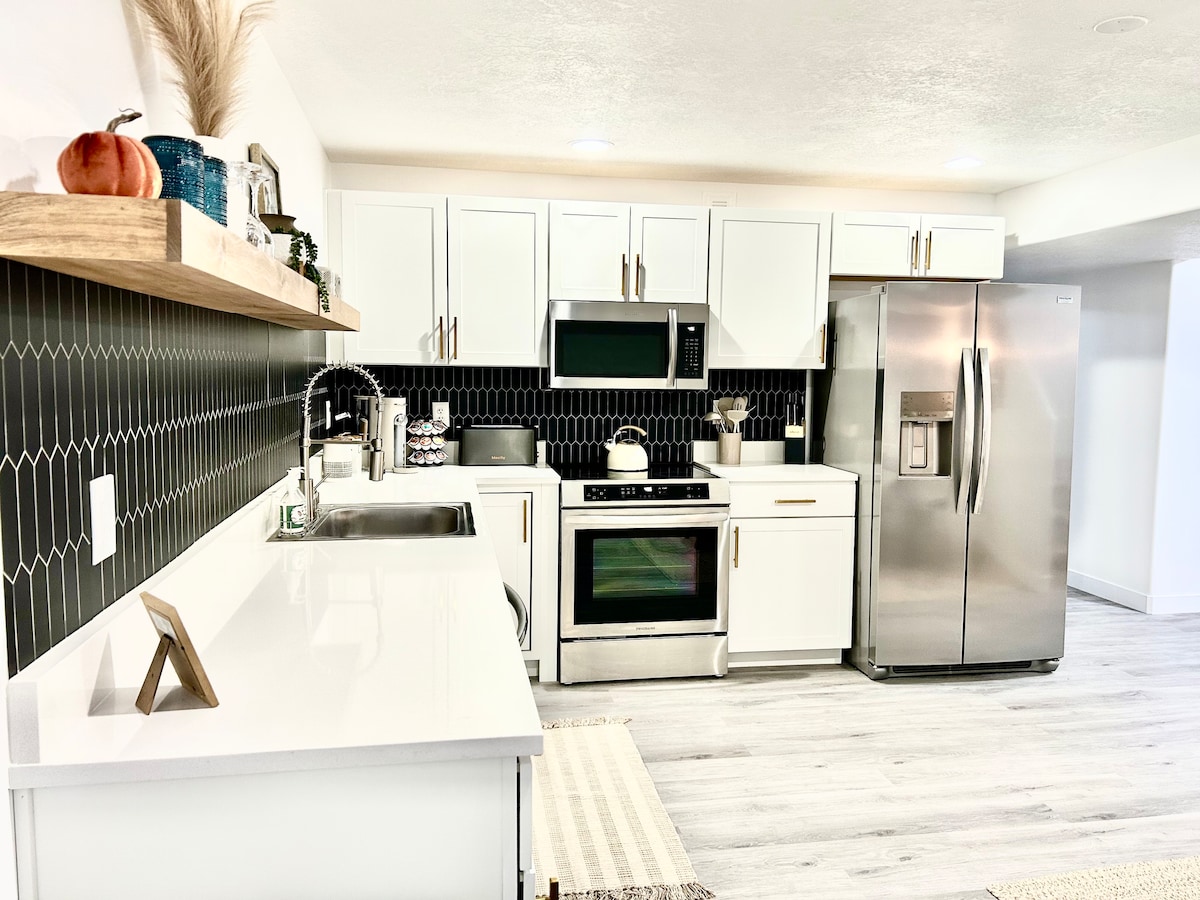 ಈ ಸೊಗಸಾದ ಸ್ಥಳವು ಸ್ನೇಹಿತರ ಟ್ರಿಪ್ ಅಥವಾ ಸಣ್ಣ ಕುಟುಂಬಗಳಿಗೆ ಸೂಕ್ತವಾಗಿದೆ. ಸಾಕಷ್ಟು ನೈಸರ್ಗಿಕ ಸೂರ್ಯನ ಬೆಳಕಿನೊಂದಿಗೆ, ಈ ಹೊಸ ಅಪಾರ್ಟ್ಮೆಂಟ್ನಲ್ಲಿ ಸಂಪೂರ್ಣ ಸೌಕರ್ಯಗಳಿರುವ ಅಡುಗೆಮನೆ, ಬಾತ್ರೂಮ್, ವಾಷರ್ ಮತ್ತು ಡ್ರೈಯರ್ನ ಸೌಕರ್ಯಗಳನ್ನು ಗೆಸ್ಟ್ಗಳು ಆನಂದಿಸಲು ಸಿದ್ಧವಾಗಿದೆ. ಸಾಂಟಾಕ್ವಿನ್ ಕ್ಯಾನ್ಯನ್ ಮತ್ತು ಪೋಲ್ ಕ್ಯಾನ್ಯನ್ನ ತಳದಲ್ಲಿ ತೋಟಗಳ ಬಳಿ ಇದೆ. ನೆರೆಹೊರೆಯ ಕೊಳದಲ್ಲಿ ಮೀನುಗಾರಿಕೆಯನ್ನು ಆನಂದಿಸಿ, ಫ್ರಿಸ್ಬೀ ಗಾಲ್ಫ್ ಆಡಿ ಅಥವಾ ನಿಂಜಾ ರೋಪ್ಸ್ ಕೋರ್ಸ್ನಲ್ಲಿ ನಿಮ್ಮ ಕೌಶಲ್ಯಗಳನ್ನು ಪರೀಕ್ಷಿಸಿ. ರೌಲಿಯ ರೆಡ್ ಬಾರ್ನ್ನಿಂದ 6 ನಿಮಿಷಗಳು ಮತ್ತು ಪ್ರೊವೊದಿಂದ 24 ನಿಮಿಷಗಳು.