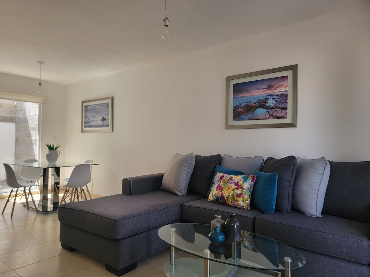ಈ ಆಧುನಿಕ ಕೈಗಾರಿಕಾ ಶೈಲಿಯ ಅಪಾರ್ಟ್ಮೆಂಟ್ನಿಂದ ಕ್ವೆರೆಟಾರೊದಲ್ಲಿ ಅತ್ಯಂತ ಉಸಿರುಕಟ್ಟಿಸುವ ವೀಕ್ಷಣೆಗಳನ್ನು ಅನ್ವೇಷಿಸಿ. ಡೌನ್ಟೌನ್ನಿಂದ ಕೇವಲ 10 ನಿಮಿಷಗಳ ದೂರದಲ್ಲಿ, ನಗರ ಮತ್ತು ಪರ್ವತದ ಅದ್ಭುತ ನೋಟಗಳನ್ನು ಆನಂದಿಸಿ. 6 ರವರೆಗಿನ ಗುಂಪುಗಳಿಗೆ ಸೂಕ್ತವಾಗಿದೆ. ಸುಲಭ ಪ್ರವೇಶ, ಅಂಗಡಿಗಳು ಮತ್ತು ನಿಮ್ಮ ವಾಸ್ತವ್ಯವನ್ನು ಪರಿಶೀಲಿಸುವ ಸಾಮರ್ಥ್ಯಕ್ಕಾಗಿ ವ್ಯವಹಾರದ ಟ್ರಿಪ್ಗಳು ಅಥವಾ ಸಂತೋಷಕ್ಕೆ ಇದು ಸೂಕ್ತವಾಗಿದೆ. ರೂಮ್ಗಳು A/C ಮತ್ತು ಹೀಟಿಂಗ್ ಅನ್ನು ಹೊಂದಿವೆ. ಈ ಅಪಾರ್ಟ್ಮೆಂಟ್ ನೀಡುವ ಆರಾಮವನ್ನು ಅನುಭವಿಸಿ.