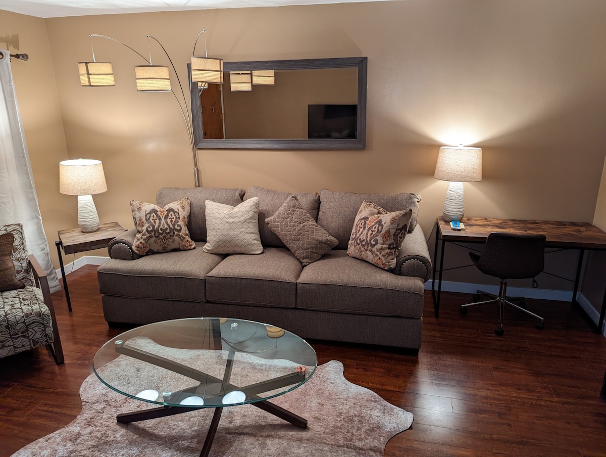 ಚಿಕ್, ಹೈ-ಎಂಡ್ ಫಿನಿಶ್ಗಳು ಆರಾಮದಾಯಕ ಐಷಾರಾಮಿಯನ್ನು ಉದಾಹರಣೆಯಾಗಿ ತೋರಿಸುವ ಈ ಸಂಪೂರ್ಣವಾಗಿ ನವೀಕರಿಸಿದ ಮನೆಯನ್ನು ಪೂರ್ಣಗೊಳಿಸುತ್ತವೆ. ಈ 1 ಬೆಡ್ರೂಮ್ ವಿಶಾಲವಾಗಿದೆ ಮತ್ತು ದಂಪತಿ ಅಥವಾ ವ್ಯವಹಾರ ಪ್ರಯಾಣಿಕರಿಗೆ ಸೂಕ್ತವಾಗಿದೆ. ○ 50"ಮೂಲ ಕೇಬಲ್ ಮತ್ತು ಆ್ಯಪ್ಗಳೊಂದಿಗೆ ರೋಕು ಸ್ಮಾರ್ಟ್ ಟಿವಿ ಡಿಶ್ವಾಶರ್, ಫಿಲ್ಟರ್ ಮಾಡಿದ ನೀರು, ಐಸ್ ಮೇಕರ್, ಕ್ಯೂರಿಗ್, ಕುಕ್ವೇರ್, ಬೇಕ್ವೇರ್, ಪಾತ್ರೆಗಳು ಇತ್ಯಾದಿಗಳನ್ನು ಹೊಂದಿರುವ ○ ಪೂರ್ಣ ಅಡುಗೆಮನೆ. ○ರಿಸರ್ವ್ ಮಾಡಿದ ಗ್ಯಾರೇಜ್ ಪಾರ್ಕಿಂಗ್ (ಕಾಂಪ್ಯಾಕ್ಟ್) ಟಬ್/ಶವರ್, ಪರಿಸರ ಸ್ನೇಹಿ ಸೋಪ್ಗಳನ್ನು ಹೊಂದಿರುವ ○ಟೈಲ್ಡ್ ಬಾತ್ರೂಮ್ ○ಸೆಂಟ್ರಲ್ ಹೀಟ್ & A/C ○ಸಾಕಷ್ಟು ನೈಸರ್ಗಿಕ ಬೆಳಕು ○ರೆಸ್ಟೋರೆಂಟ್ಗಳಿಗೆ ನಡೆಯಬಹುದು ○ಸುಲಭ ಎಲೆಕ್ಟ್ರಾನಿಕ್ ಲಾಕ್